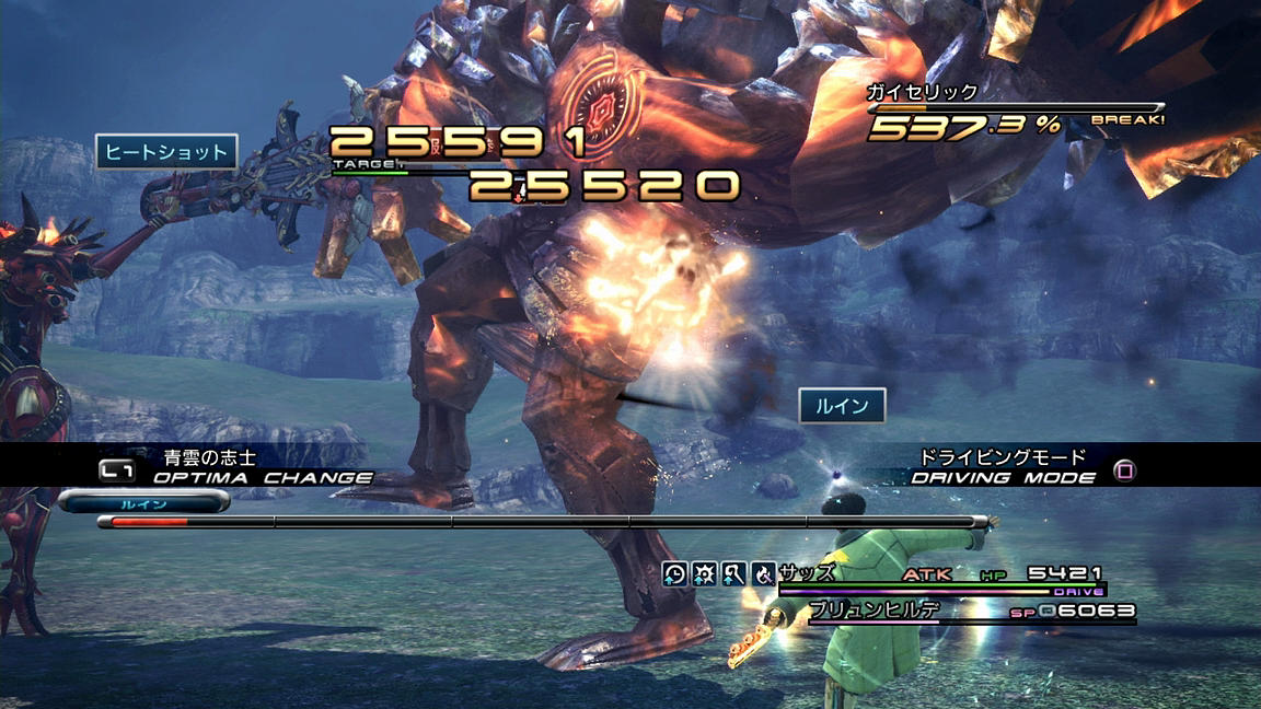 と行きたいところであるが、残念ながらそんなものは無く、しかも「ブレイブ」すら存在しないため、元々の物理攻撃力の低さも相まって、与ダメージは1/3以下である。それでも頑張ってダメージを与えていき、ブレイク時間が半分あたりになったらドライビングモードに変形、時間ギリギリまで「バスターフォース」を撃ち込み、「ガイアサルヴォーLv.3」でトドメである。非常に際どいところであったが、何とか1ブレイクで倒しきることができた。