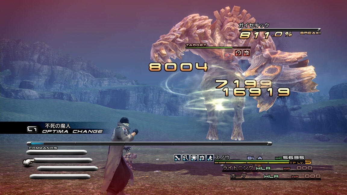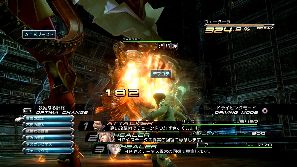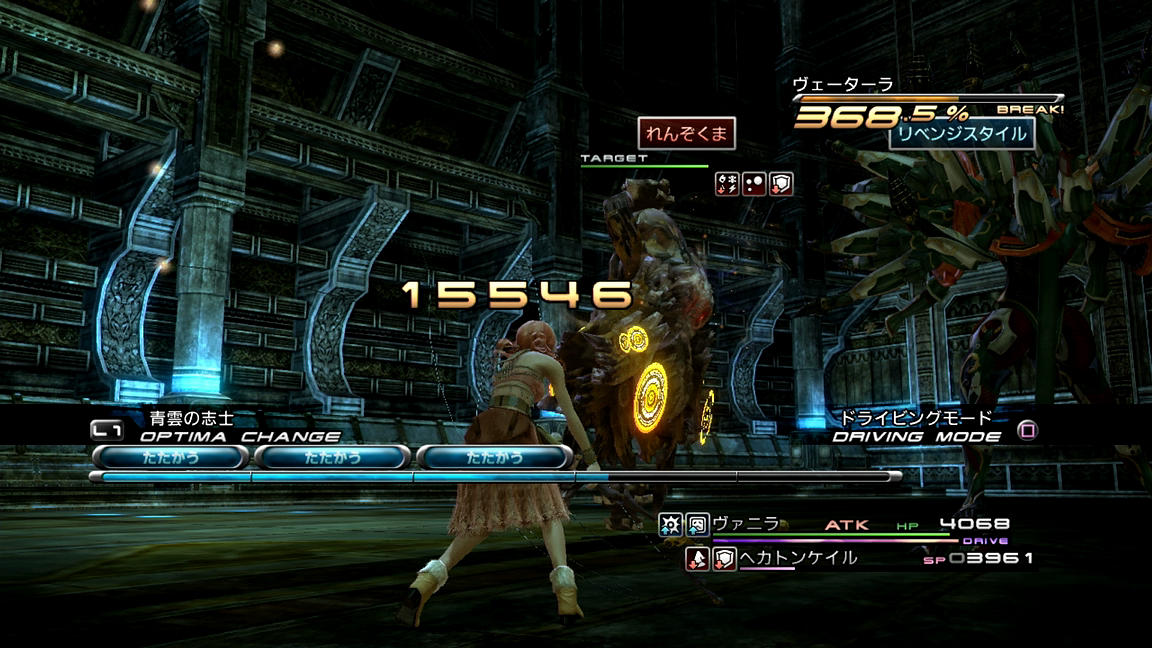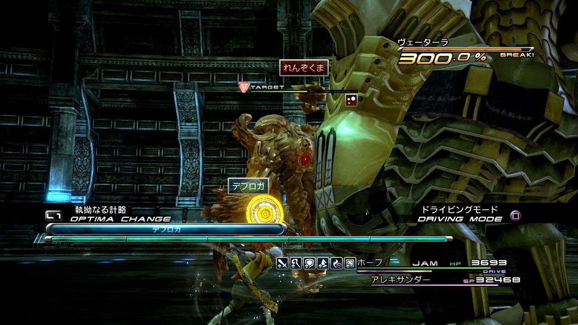 ――それでも、めげずに戦っていくことにする。いつも通り、ATKとBLAを使って相手をブレイクまで持っていき、その後にまずはバイオ、そしてデプロテを入れていく。FF13でのステータス異常の成功率は確率制なのであるが、そのシステムは「基本命中率に耐性とロールボーナス(Lv.1なら1.2倍)とチェーン値を掛ける」方式となっており、しかも持続時間も『13-2』の「『チェーンボーナスの上昇値』の100.0%を0.1倍としてプラスする」パターンとは異なり、『13』では「チェーン倍率をそのまま持続時間に掛ける(200.0%の時、『13-2』なら1.1倍だが『13』なら2倍)」形となっているため、1ブレイクで倒せない相手に対しては、ブレイク中に弱体化を掛ける戦術が非常に有用なのである。