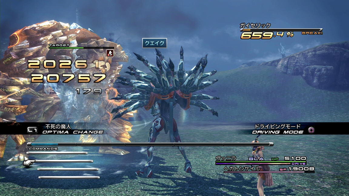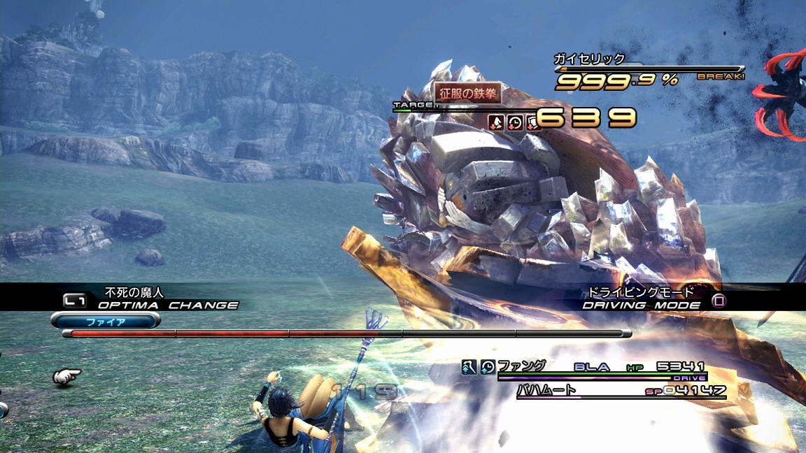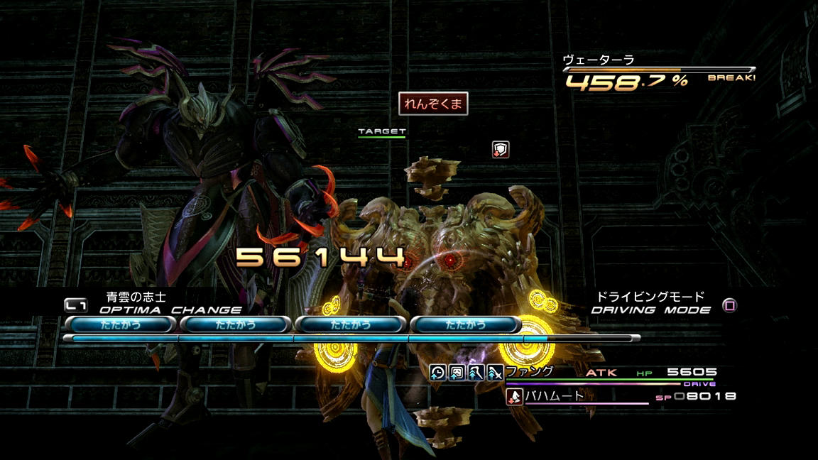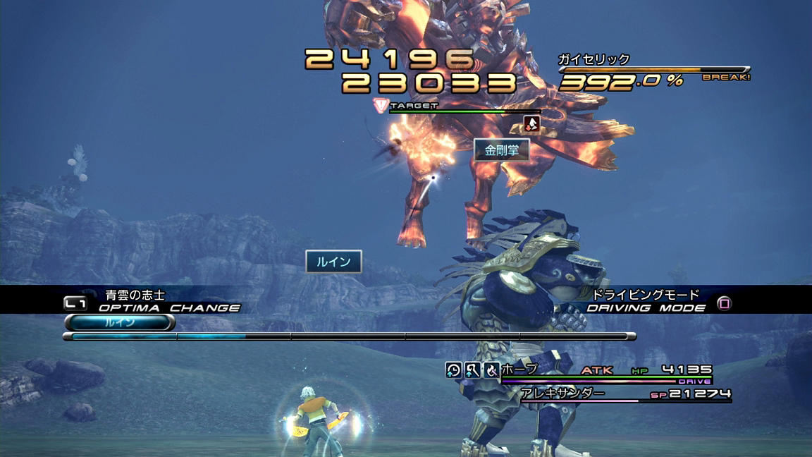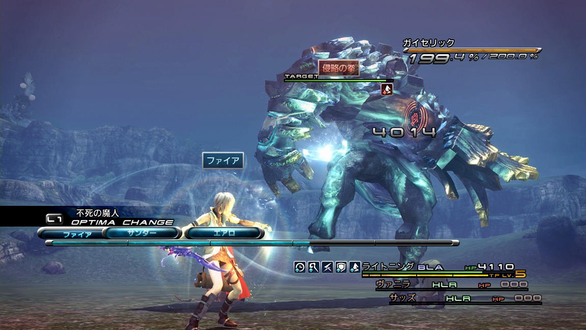 ――それでも、めげずに戦っていくことにする。いつも通り、ATKとBLAを使って相手をブレイクまで持っていき、その後にまずはバイオ、そしてデプロテを入れていく。FF13でのステータス異常の成功率は確率制なのであるが、そのシステムは「基本命中率に耐性とロールボーナス(Lv.1なら1.2倍)とチェーン値を掛ける」方式となっており、しかも持続時間も『13-2』の「『チェーンボーナスの上昇値』の100.0%を0.1倍としてプラスする」パターンとは異なり、『13』では「チェーン倍率をそのまま持続時間に掛ける(200.0%の時、『13-2』なら1.1倍だが『13』なら2倍)」形となっているため、1ブレイクで倒せない相手に対しては、ブレイク中に弱体化を掛ける戦術が非常に有用なのである。
