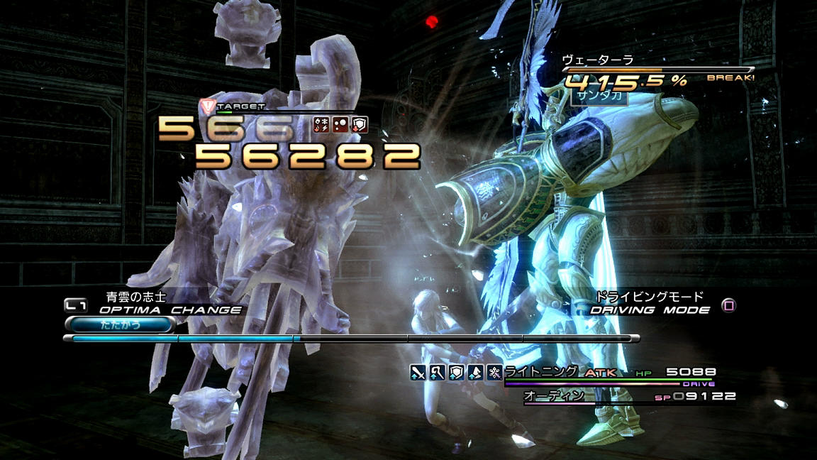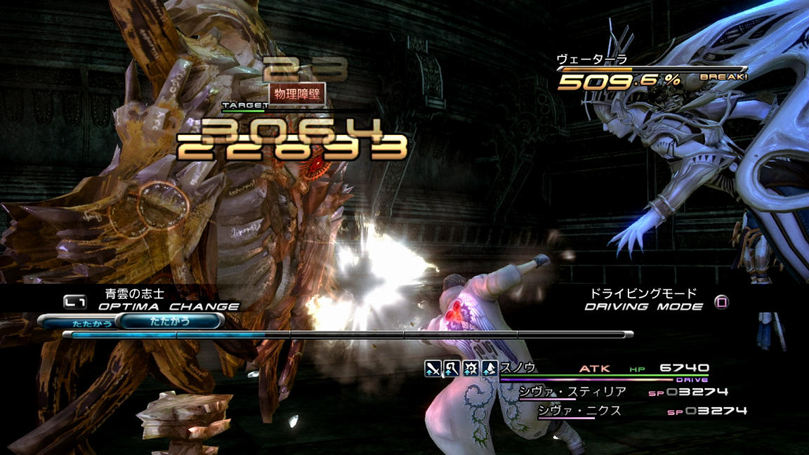 …それでも、他に良さげな戦略も見つからないということで、正攻法を仕掛ける他は有るまい。ATKでチェーン持続時間を積み、BLAでひたすら攻撃である。そしてブレイク直前になったらシヴァ姉妹を召喚し、ブレイク成功と同時にATKの「たたかう」で攻撃を仕掛けていく。そのダメージは20000前後と標準的なものであるため、とにかく回数を積んでダメージを増やしていくしか無い。そうこうしているうちに、敵は「物理障壁」でバリアを張ってしまった。こうなるともう通常攻撃でのダメージは期待できないため、あとはドライビングモードに全てを掛ける。時間ギリギリまでひたすら「ウィリーラッシュ」を入力し、最後は「ダイヤモンドダストLv.3」を使用。約60000ダメージを与え、ギリギリで1ブレイク撃破をすることができた。ふう…。