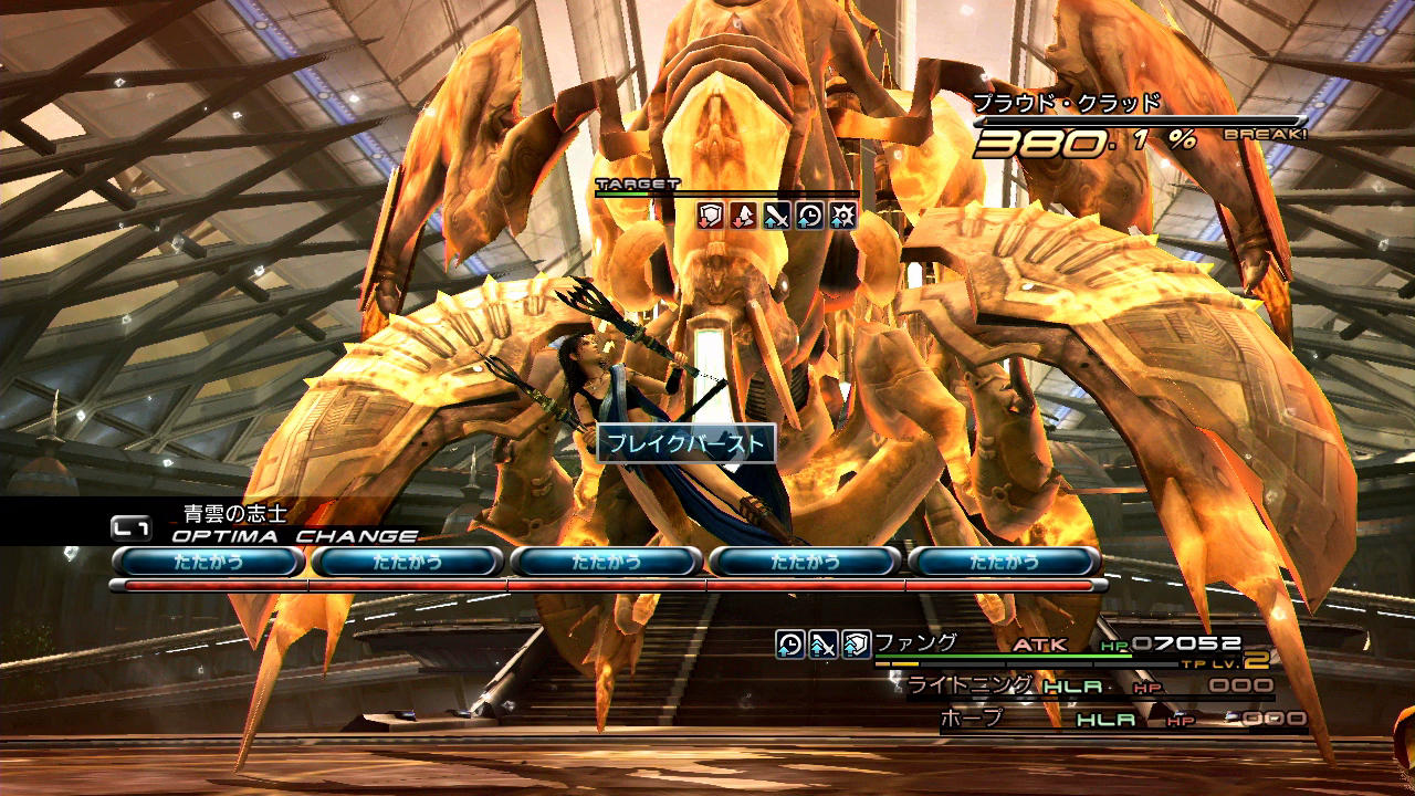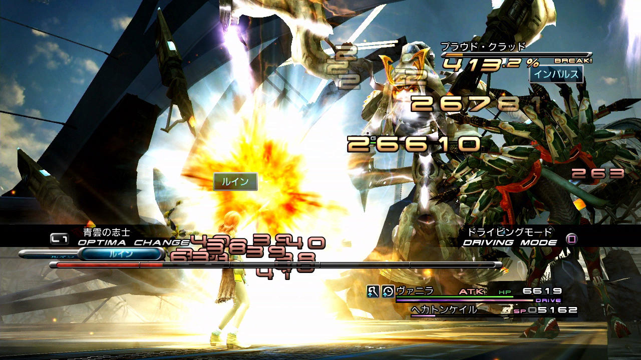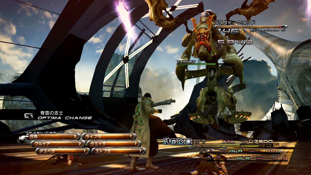 ――その他の点として、このプラウド・クラッド(1回目)は全属性を半減するうえにチェーン耐性が「90」とあって、なかなかブレイクさせづらい部類に入る。第5回のラクタヴィージャ戦でも触れたように、初代FF13ではチェーン耐性を貫通する「バトルの状況による補正」でさえ、属性耐性によって減少をさせられてしまう。そのため、BLAで異なるコマンドを交互に入力して5回攻撃したとして、だいたいチェーン上昇値は+5.0%と言ったところであろうか。しかも、BLAの行動ではチェーン時間を稼げないため、別途ATKまで用いる必要が出てくる。こういうことが一般的な特性としてあるからこそ、属性を持たないサッズのエリアブラストチェンジ技や、耐性を貫通しつつ上昇値・持続時間の両方を稼げる召喚獣が珍重されるのである。