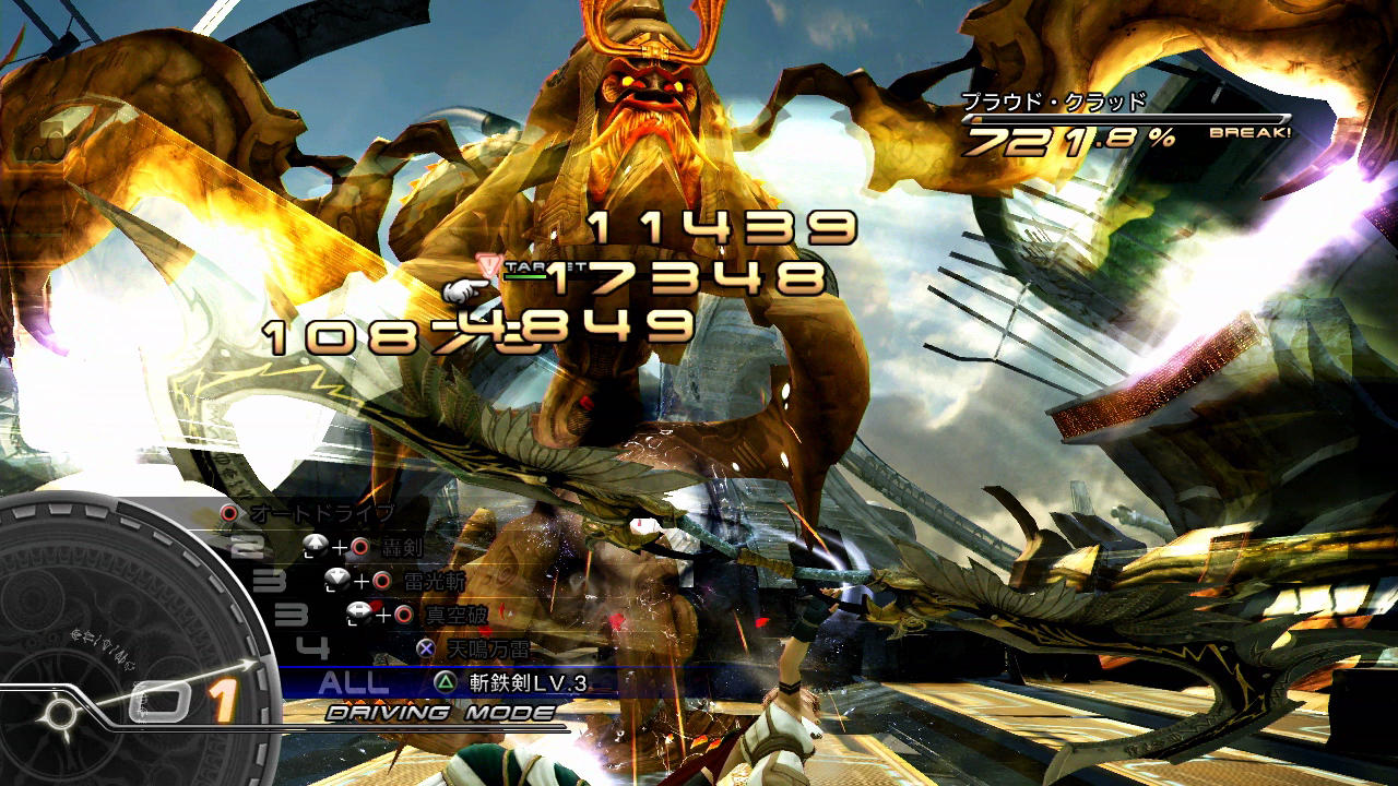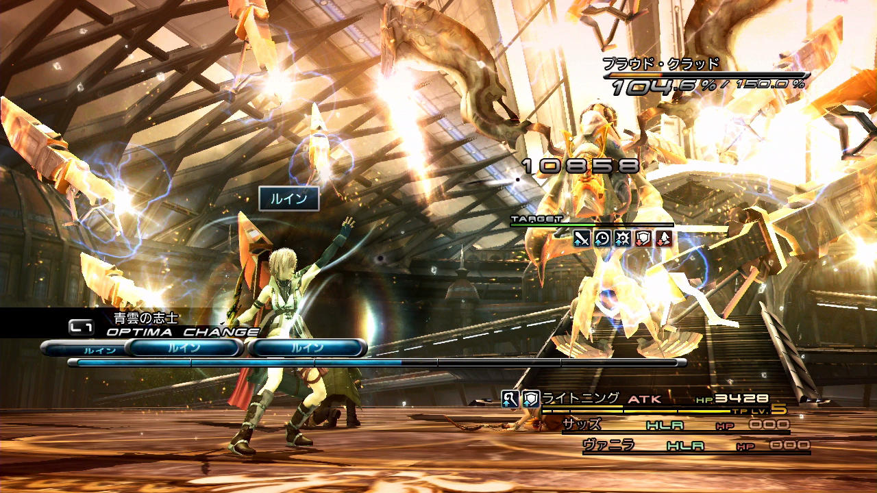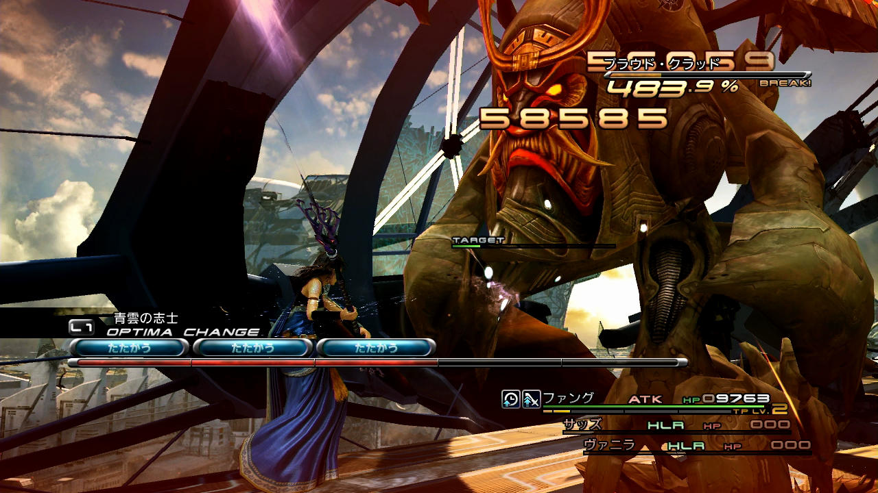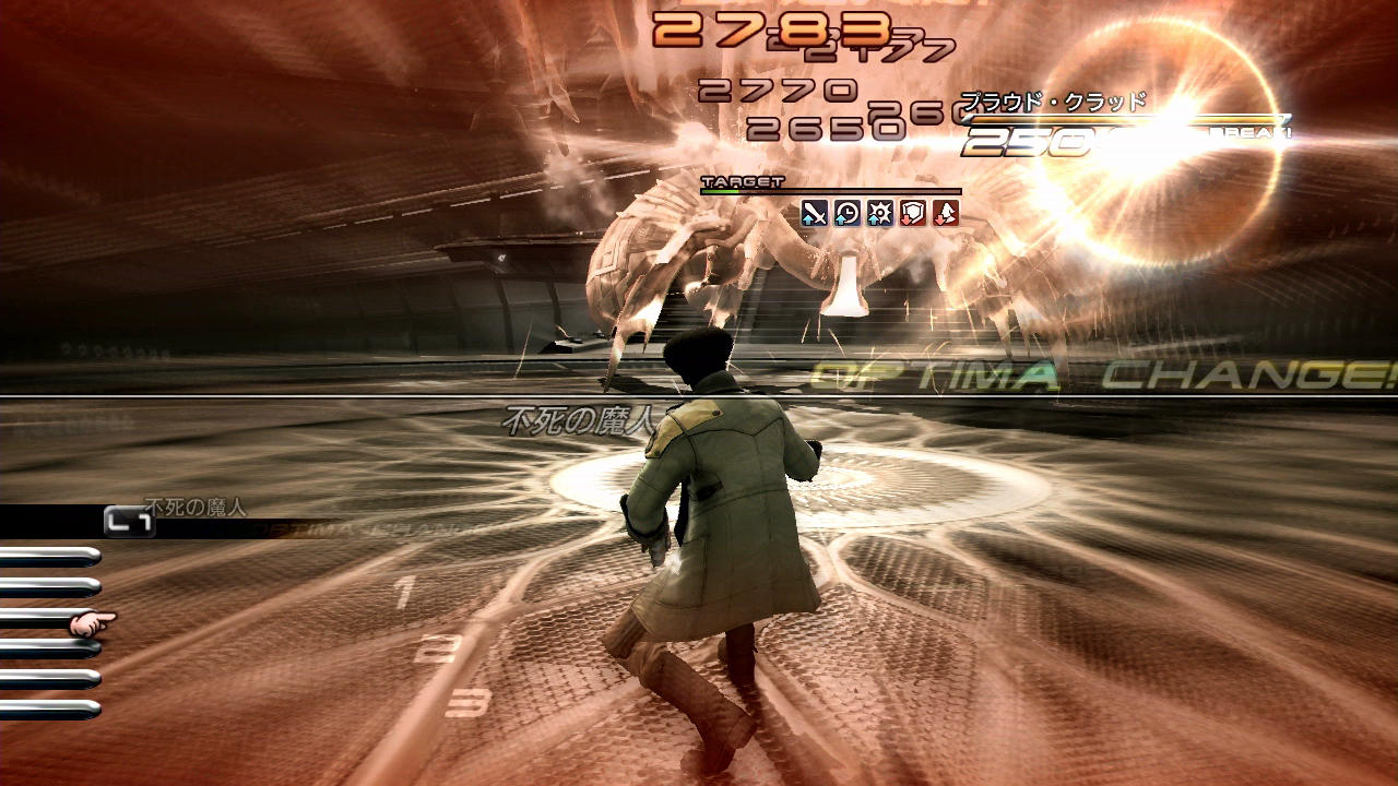 ――その他の点として、このプラウド・クラッド(1回目)は全属性を半減するうえにチェーン耐性が「90」とあって、なかなかブレイクさせづらい部類に入る。第5回のラクタヴィージャ戦でも触れたように、初代FF13ではチェーン耐性を貫通する「バトルの状況による補正」でさえ、属性耐性によって減少をさせられてしまう。そのため、BLAで異なるコマンドを交互に入力して5回攻撃したとして、だいたいチェーン上昇値は+5.0%と言ったところであろうか。しかも、BLAの行動ではチェーン時間を稼げないため、別途ATKまで用いる必要が出てくる。こういうことが一般的な特性としてあるからこそ、属性を持たないサッズのエリアブラストチェンジ技や、耐性を貫通しつつ上昇値・持続時間の両方を稼げる召喚獣が珍重されるのである。