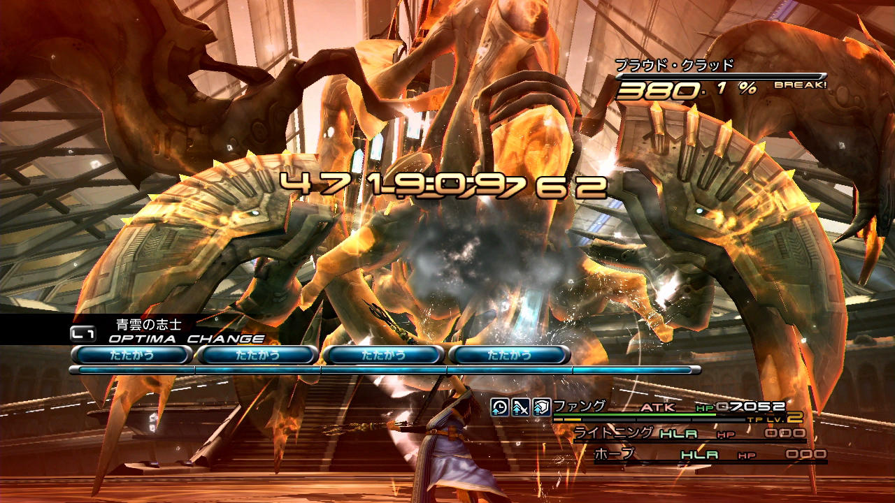 そんなこんなで、正念場であるプラウド・クラッド(2回目)とのバトルに足を進めていくのであるが…このバトルにおいてライトニングさんが独自性を出せるポイントは全く無い。まるで、ホモゲー乙女ゲーに出てくる女主人公がごとく、である。