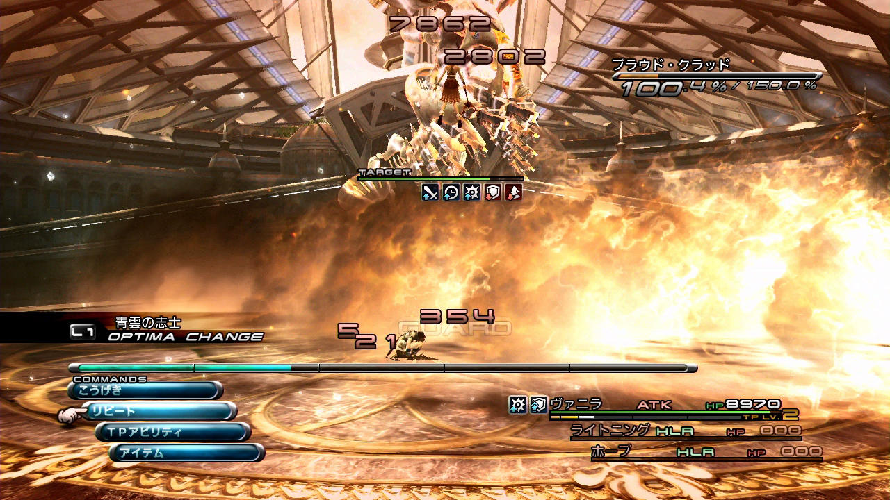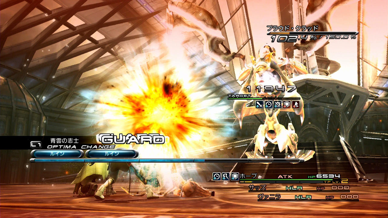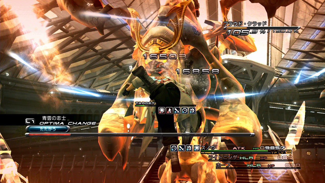 …さて、このプラウド・クラッド1回目戦におけるスノウの流れは、ライトニングと酷似している。これと言った決め手が無いため、召喚獣での1ブレイク撃破を目指し、ENHで強化してATKで攻めていく。ブレイク前の粘りが必要という点まで、ライトニングと同じである。異なるポイントとして、こちらは「ヘイスト」「ガッツ」が使える代わりに召喚獣の火力が低いため、ブレイク前で更に多く時間を掛けないといけないということだろうか。