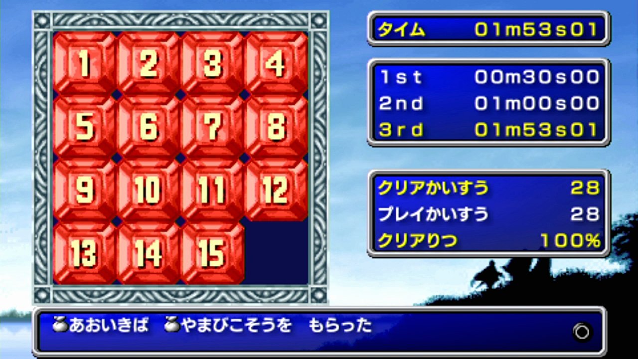…まず、このミニゲームは、ゲーム序盤に船を手に入れた後に、例えばPSP版なら「○を押したまま×を25回」など、特定のコマンド入力で遊ぶことができる。なんと、初代のファミコン版から存在する。当時のゲームと言うと、メディア容量が異様に厳しかったことで知られるが、そんな隙間にミニゲームを押し込んでしまうとは、恐ろしいものだ。さすが、ファミコン時代の伝説のプログラマー、ナーシャ・ジベリである。そして、その後のバージョンのFF1においても、いわゆるガラケー版を除いて、15パズルは引き継がれているようだ。