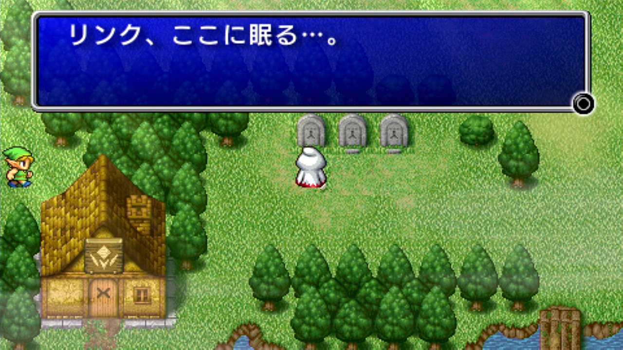 …が、それよりも印象に残るのが、エルフの町にある「リンク、ここに眠る…」という墓石である。リンクとは、ご存じ、ゼルダシリーズに出てくる主人公の少年である。ちなみに、初めて知ったのだが、同一人物ではなく、作品ごとに異なる人間ということのようだ。それはともかくとし、他ゲーム会社の人気キャラクターを勝手に殺して埋めるというのはどういう了見かというところである。だが、そもそも根本的な始まりは、「リンクの冒険」というディスクシステム(ファミコンの周辺機器)で発売された横スクロールアクションに、「ユウシャ