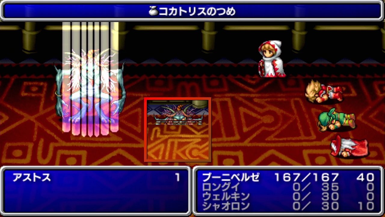 …のだが、ここでも救済ということなのか、抜け道が用意されている。アストスには石化が効くため、15パズルで手に入る「コカトリスの爪」を使うと、一撃死させることができるのだ。なお、この命中率は「サイレス」と同じということであり、わざわざ魔法を封じる必要は無く、初ターンから普通に「コカトリスの爪」を使っていけば良い。勝敗という意味での成功率は変わらないが、こちらは速攻で勝負が付くので、時間的な意味で楽をできる。