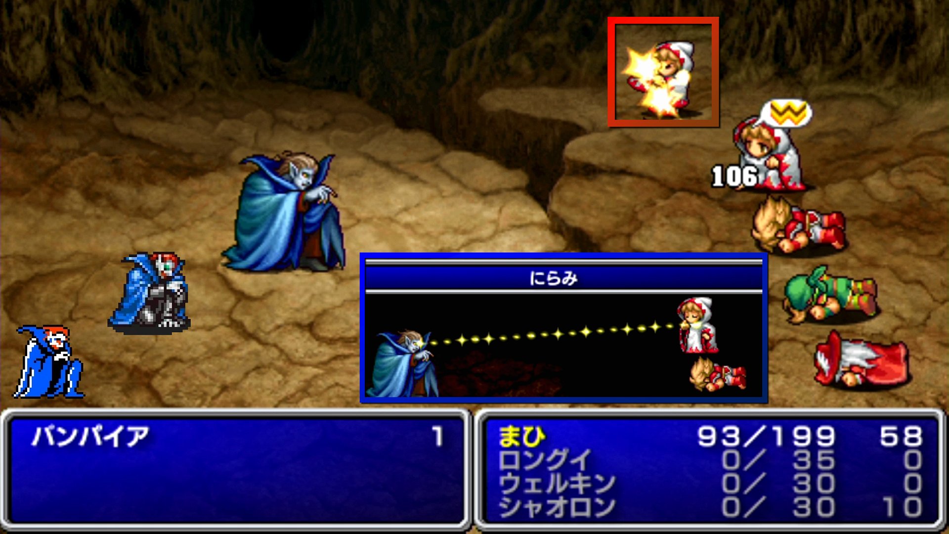 ――さて。FF1では、麻痺状態だと回避率が0となり、「ブリンク」で上がったぶんも無効となる。しかも、バンパイアの打撃攻撃力は非常に高く、HP199の白魔術師でも2〜3発貰ったら終わる。そして、打撃の追加効果としての麻痺は、打撃自体を回避すれば良いが、麻痺にらみについては、物理回避率では避けられない。よって、麻痺させられてしまった場合、すぐに解除される場合を除き、間違いなく死亡すると言って良い。