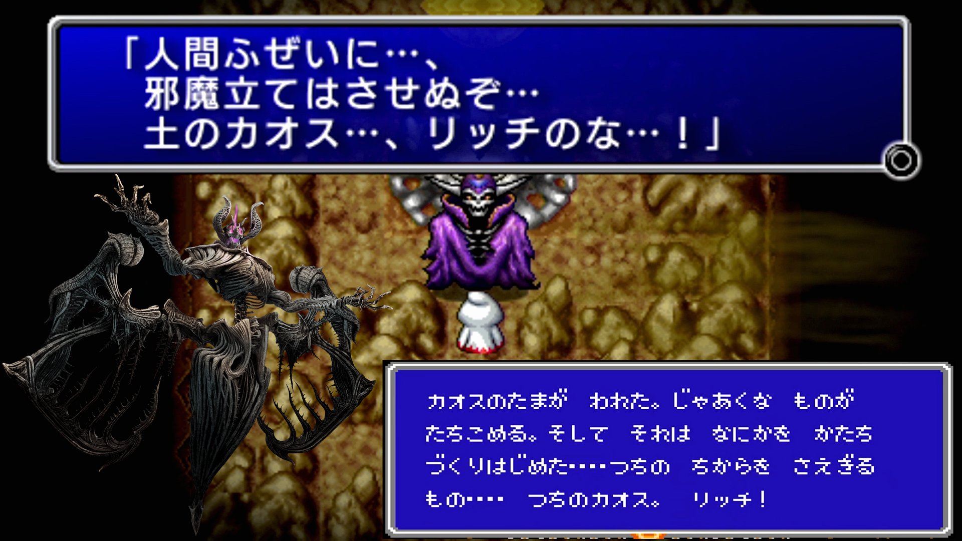…そして、地下5階の最深部では、最初の「カオス」であるリッチが待ち受けている。こいつ、ファミコン版だと、「カオスの珠が、割れた。邪悪な物が、立ち込める。そしてそれは、何かを形作り始めた…。土の力を遮る者…土のカオス。リッチ!」という声に出して読みたい日本語とともにバトルが開始される。だが、これを喋っている奴は何者なんだよと思われたためか、後に発売するバージョンでは、ごく普通にリッチが開始時のセリフを喋っている。まあこれにより、少なくとも、リッチがこのリッチなナレーションを提供してくれていたという可能性は無くなっただろう。