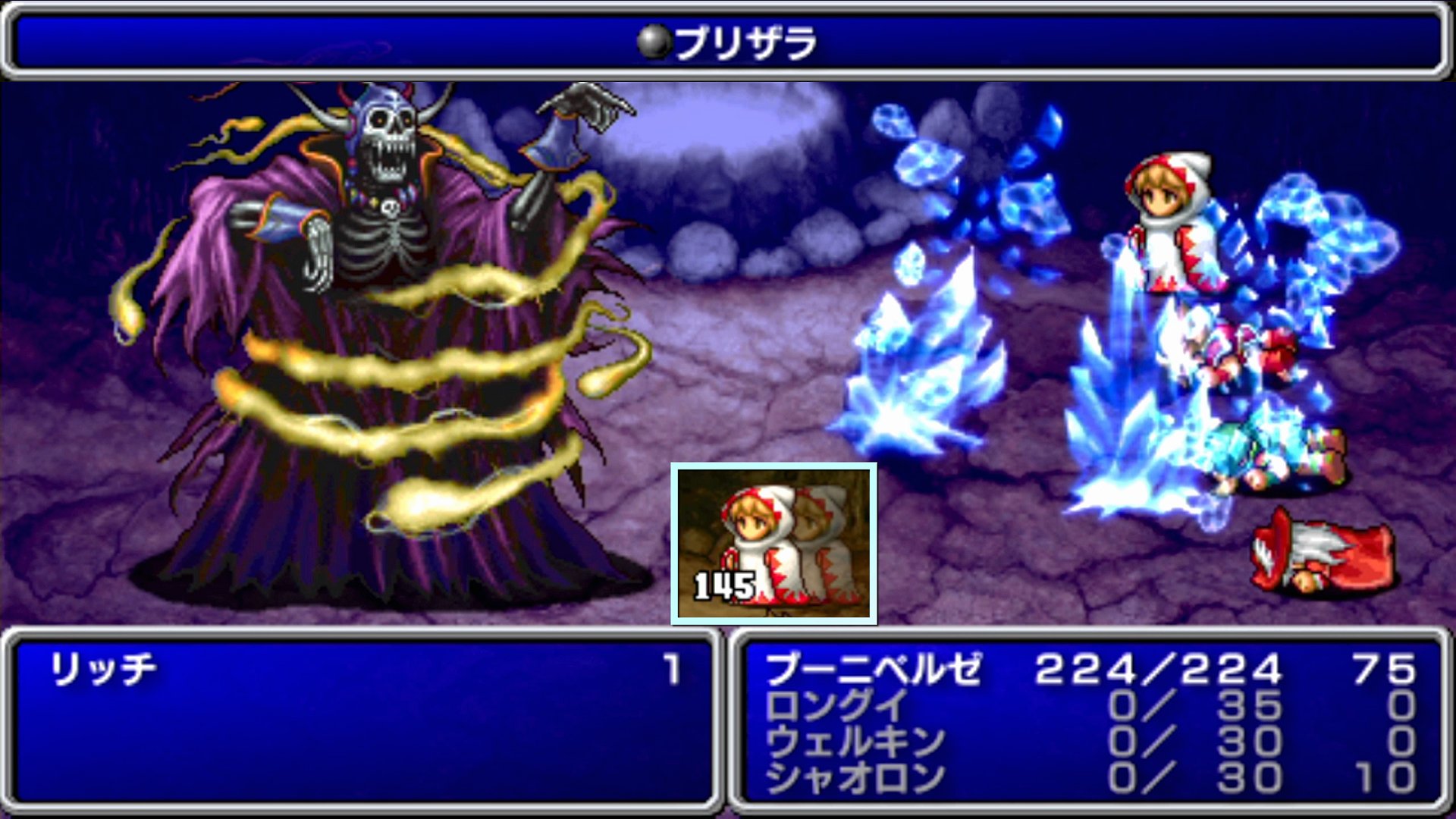 …まず、魔法については、ラ系魔法では約150のダメージを受ける。特に、PSP版の経験値テーブルだと、白魔術師の「バコルド」が間に合わない(「バサンダ」「バファイ」は唱えられる)ため、元々の威力の高さも相まって、「@ブリザラ」が、本バトルで最も高威力な魔法ということになる。なお、一応、15パズルで手に入れた「白いカーテン」を使えば、バコルド状態を発生させることも可能だが、収拾がつかなくなってしまうため、とりあえずミニゲーム系アイテムは詰むまで封印としている。そして、「Aスリプラ」「Dホールド」「Gスリプル」と行動封印系が3つもあり、これらでステータス異常を受けると、魔法と物理で一方的になぶられる。当然、すぐに自然解除が為されなければ、死が待っている。