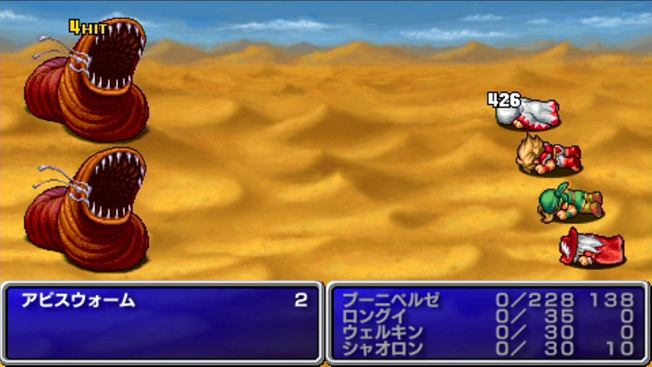 ――が、実際にはこれらが使えてしまうため、最終的なバトルの勝率は1/4程度という、あまり難関という気がしない戦いになってしまった。もちろん、ステータス吟味も、やや困難であるものの、実行可能なレベルである。まあ、FF1のシステムで勝率が低いとなると、相手の行動に左右される極端な★運ゲー★にしかならないであろうため、そうでないのは良かったか…。