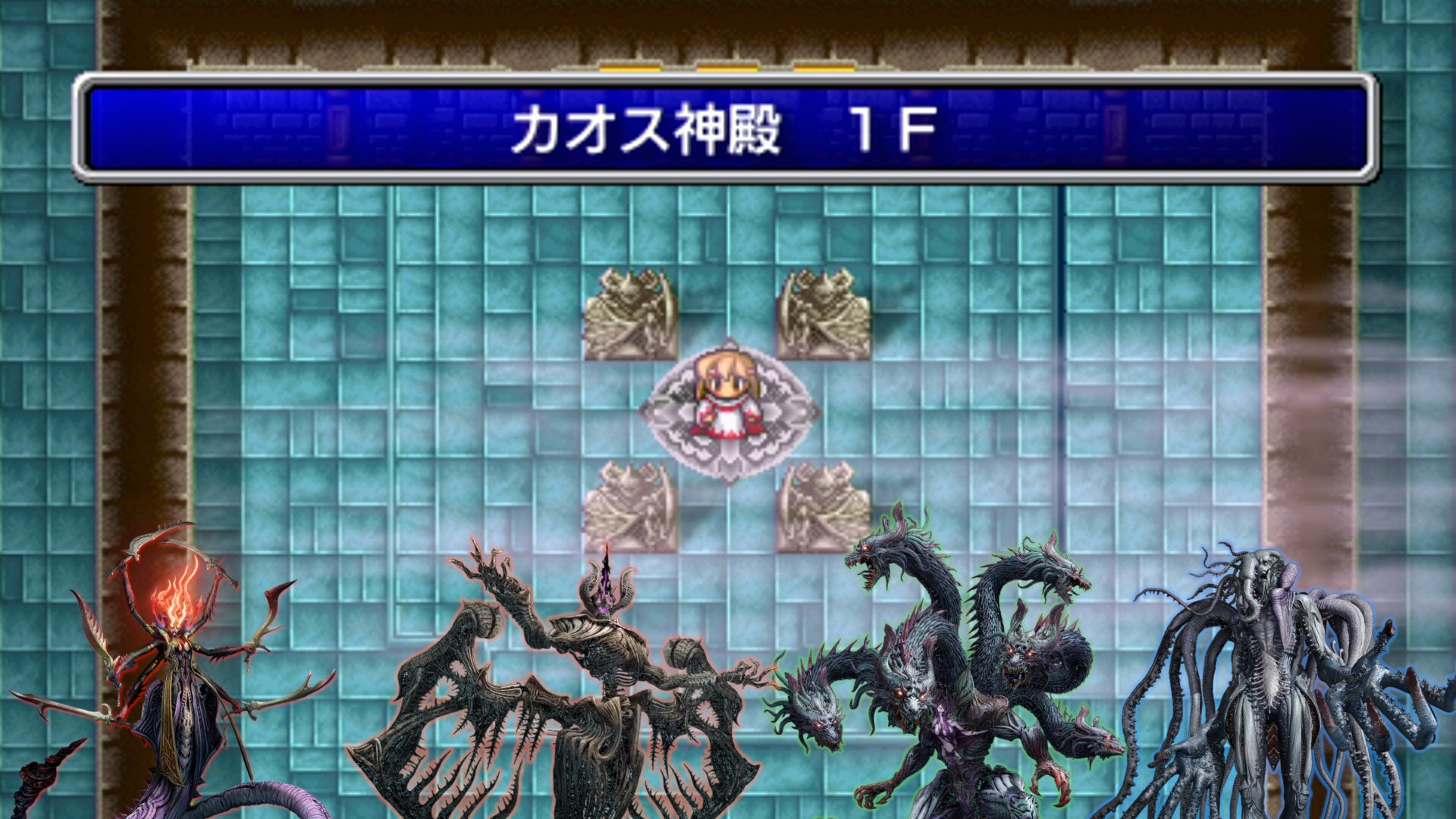 ――ちなみに。ラスボス以外の強制戦闘は、全て、FF1独自のシステムである「固定エンカウントマス」にて発生する。これにより、何も無いところから強敵が唐突に現れるという独特の演出になっているほか、途中まで進めて地上に戻ったところで、再挑戦をするとボスが復活するという難要素にも繋がっている。また、固定エンカウントマスの仕様上、いったん離れてもう一度踏むと、何度でもカオスと戦うことができる。「カオスの無限の再生能力を表現している」とか、または「この過去のカオス神殿でカオスを量産して、未来の世界へと送り込んでいる」と言った考察も可能かもしれない。