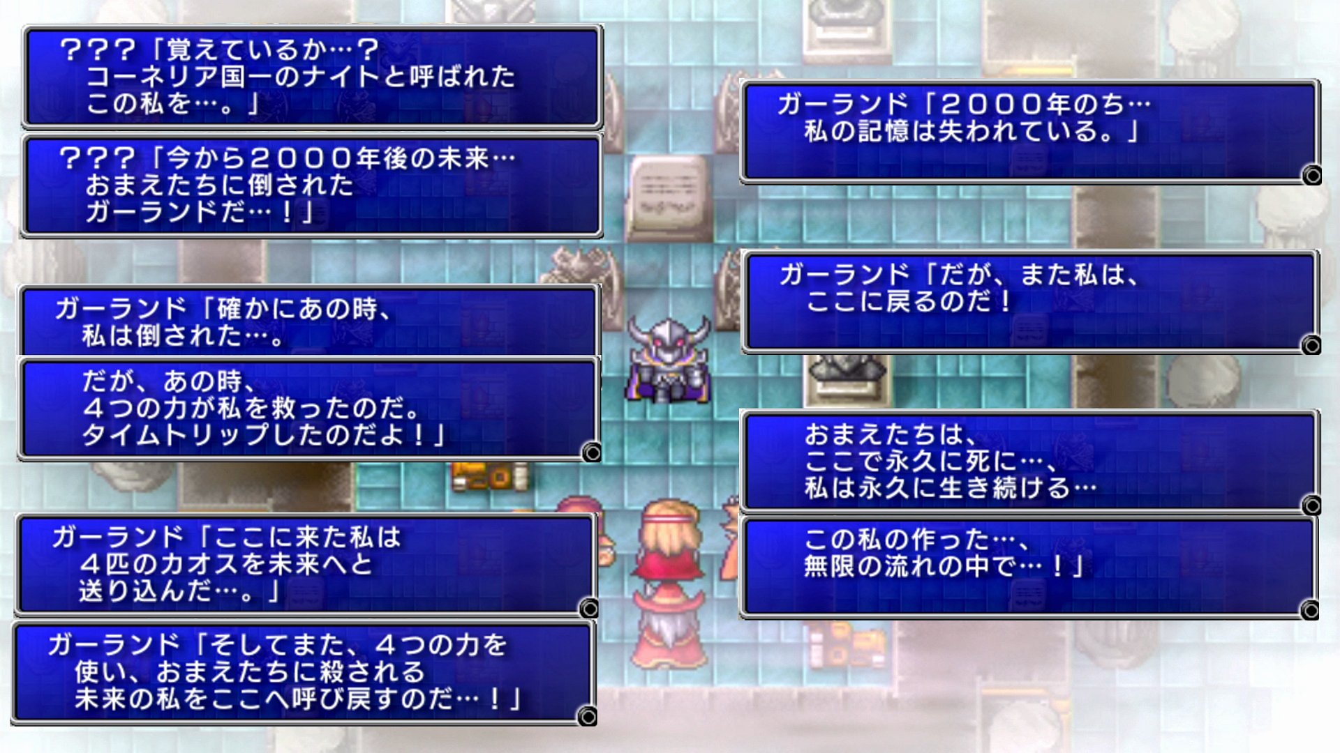 ところで。またしても変なことを思い出してしまったのだが、「ガーランド」と言えば、FF9においても、同名の人物が登場する。そこでは、悠久の時を生きる老人として、主にゲーム終盤で登場した。そしてそこでも、物語の核心部に迫る内容について、めっちゃ早口で述べてくれていた(【参考画像】)。