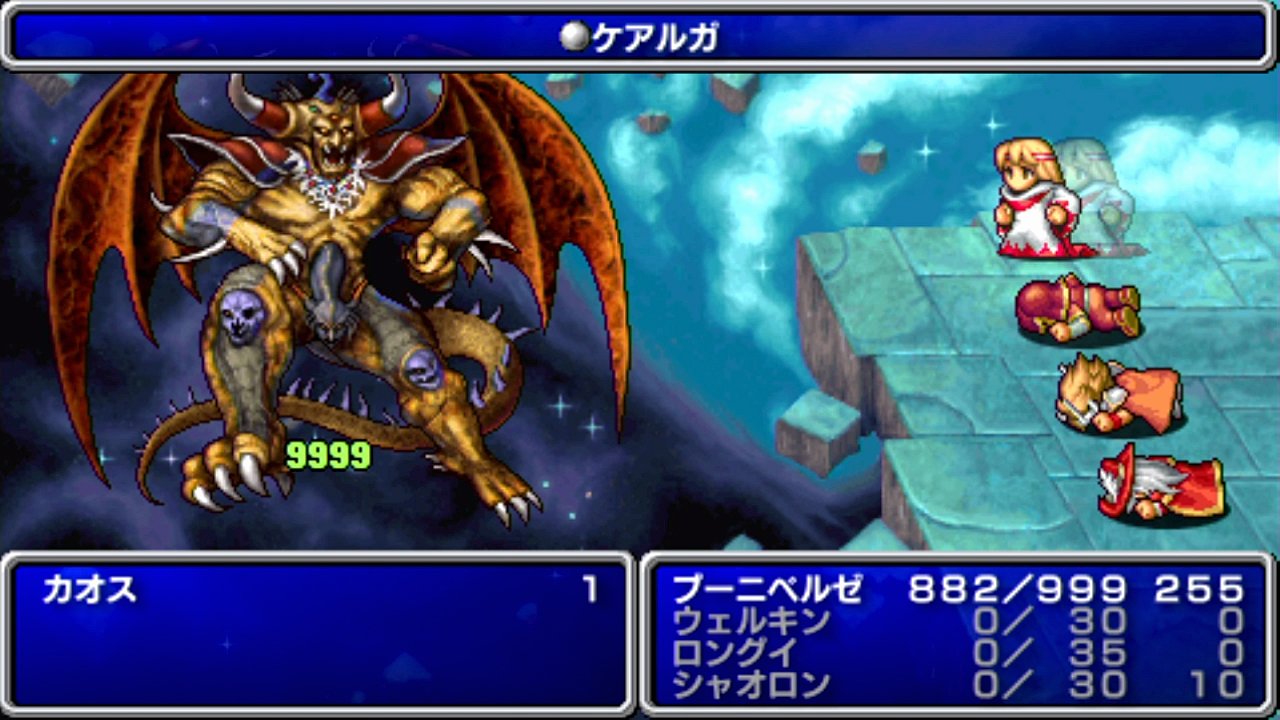 …というのも。とりわけ、途中セーブが行えないFC&WSC版(PS版は「メモファイル」によって、事実上のどこでもセーブが可能なのだとか)では、尋常ではならざる難易度となる。まず、道中が長いため、雑魚敵に屠られてしまうほか、逃げられない敵と遭遇してしまえば即座に終了である。また、ラスボスを含めた6回もの強制戦闘にも、全て連続で勝たなければ、エンディングを迎えられないことになる。ラスボスはもちろん、4体の復活カオスたちも、強力な全体攻撃を多く使用してくるため、掛け算的に確率が下がる連続勝利は、かなり難しくなってくるのだ。