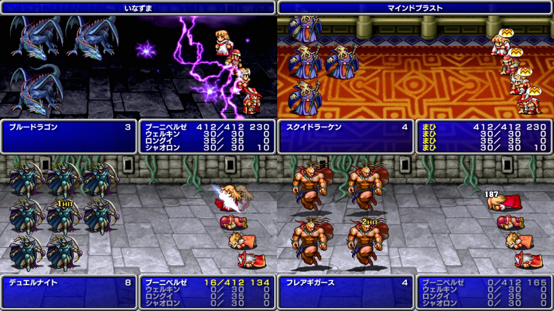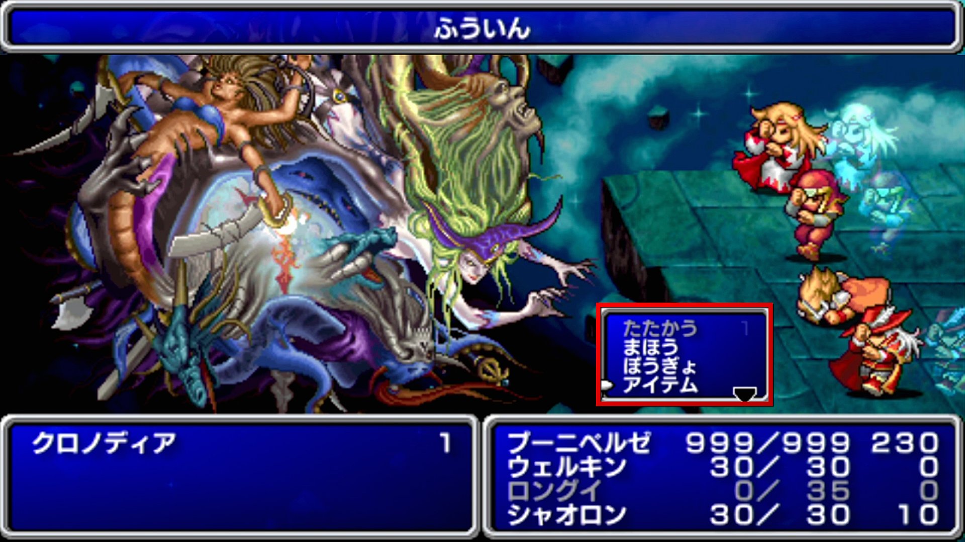 ――よって、今回は、これまで使って来なかった「戦闘不能者の復活」も解禁し、3ターン目にて、忍者が「フェニックスの尾」で白魔導士を蘇生させた。戦闘不能で強化がどうなるかは全く知らないが、少なくともHP999は解除されないため、開幕よりも有利な状況から再開できる。更に、同一ターンで他の2人は、無駄を承知で「ラストエリクサー」を合計2回入力しておき、即座に白魔導士のHPを999へと回復させる。