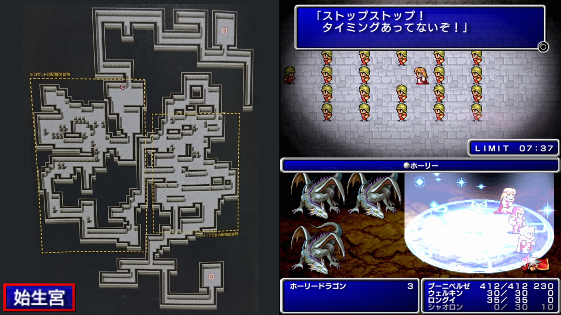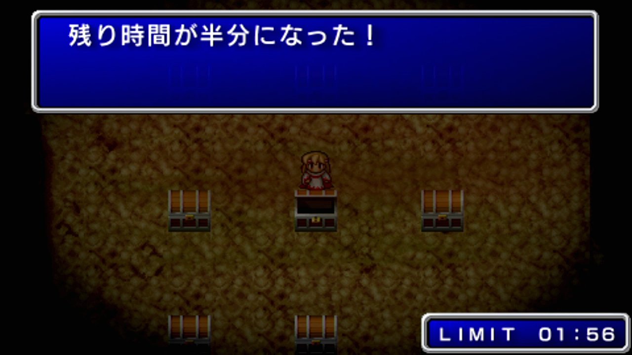 しかし。このダンジョンでは、「時」をテーマとしているということで、滞在時間が5分増えるごとに、ランダムエンカウントする雑魚敵のラインナップが強化されていく。この時間経過は、メニューを開いている間や、パズル間の移動、そして「安らぎの小部屋」で休憩している時間など、全てが含まれる。また、時間制限の意味合いを大きくするためと、どこでもセーブが可能になってヌルゲーと言われていたGBA版FF1の環境に一石を投じたかったためか、ダンジョン内ではセーブが不可能である。この2つの組み合わせが、低レベルでの攻略を極端に困難なものへと変えているのだ。