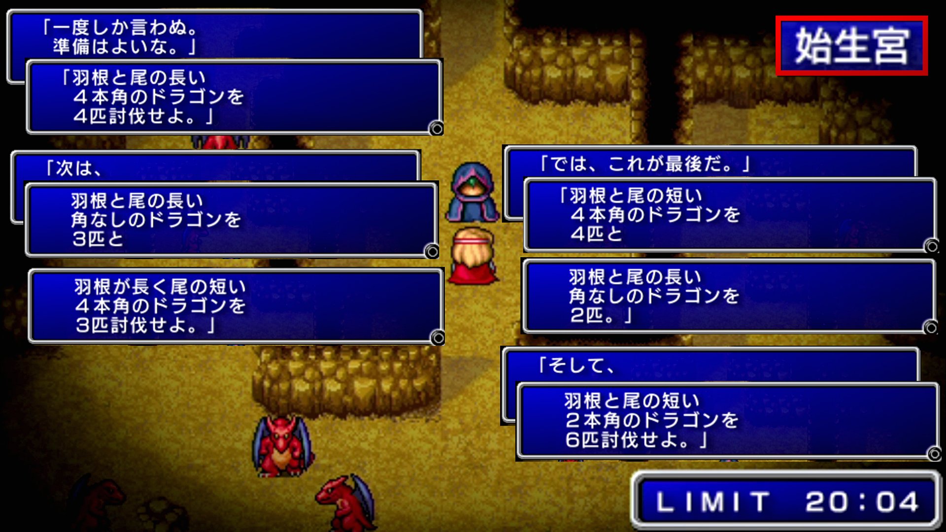 が、この討伐指令は、3回連続で突破しなければクリアとならない。1段階目は「ドラゴンAをX体」の1種類だが、2段階目は「ドラゴンAをX体」「ドラゴンBをY体」と2種類、3段階目は「ドラゴンAをX体」「ドラゴンBをY体」「ドラゴンCをZ体」の3種類となって、段違いに複雑となってくる。倒す種類や倒した数は確認ができないため、メモは必須として、それでも混乱をきたしてくる。1種類ごとの討伐数も2〜6体の幅で決まり、運が悪いと2段階目から10匹以上を倒さなければならない。そして、討伐数を1匹でも間違えたらアウトであり、なんと第1段階目からやり直しなのである!