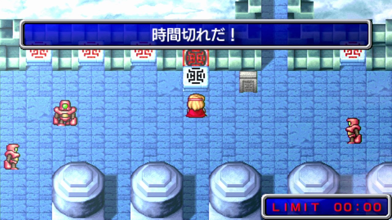 …前置きが長くなったので、このダンジョンの特徴について、再び軽くまとめておこう。「パズルを解きながら進めていく」「内部ではセーブが不可能」の2つが重要ポイントである。出現する雑魚敵は、時間経過とともに強くなっていく。この“時間”は、ダンジョンに入ってからは常時カウントが為されているため、パズルのみならず、道中全てにおいて操作を手早くすることが重要となる。また、雑魚戦については、基本的に全逃げである。本編シナリオで逃げられない敵の組み合わせであっても、この「時の迷宮」では逃走が可能である。