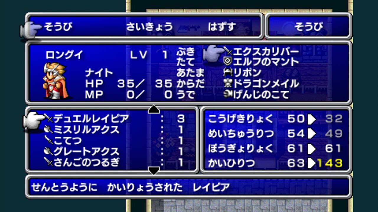 ――ちなみに、本プレイにおいては、「風のささやく洞穴」の攻略時点で、既に白魔導士1人でのソロ攻略という方針を採用していたため、そこでの影響は無い。しかし、時の迷宮においては別であり、雑魚戦が激しい難関となっていた。そこで、回避率+80を開幕から得られていれば、突破難易度を幾分かは楽にできていただろう。ちなみに、デュエルレイピアを装備可能なのは、戦士&ナイト、シーフ&忍者、赤魔術士&赤魔導士である。私は、デュエルレイピアの存在を想定して、ジョブを選んでいた…? これら3ジョブは、全てLv1の弾除けであり、その武器は“死に枠”となっていた。そこを防御能力に活かせていれば、大幅な戦力強化ができていたはずだ。こんな強力装備の存在を失念していたとは、実に情けない。是非、今後のプレイで役立てていってほしい…。