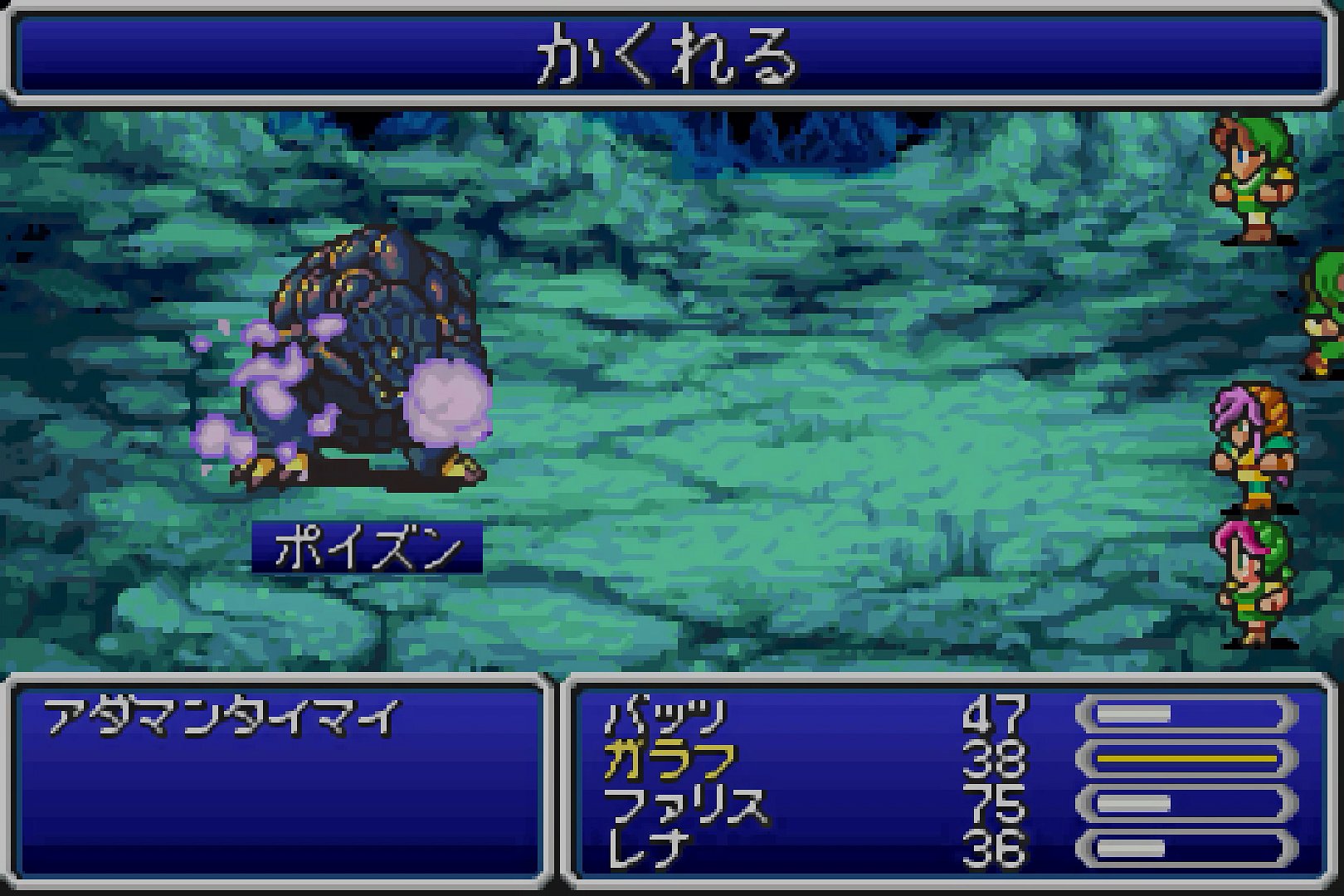 …続いてターンが回ってくるバッツとレナは、黒魔法の「ポイズン」を放ち、相手に毒を掛ける。アダマンタイマイはLv20であり、レベル1桁のこちらのメンバーとは差があるうえに、魔法回避率が「50」と高い。というわけで、2人で魔法を使って、少しでも累積の命中率を上げようという戦法だ。なお、1人目の成否が分かる前に、2人目の入力を確定してしまっても構わない。どうせどっちか1発でも当てれば勝てる。