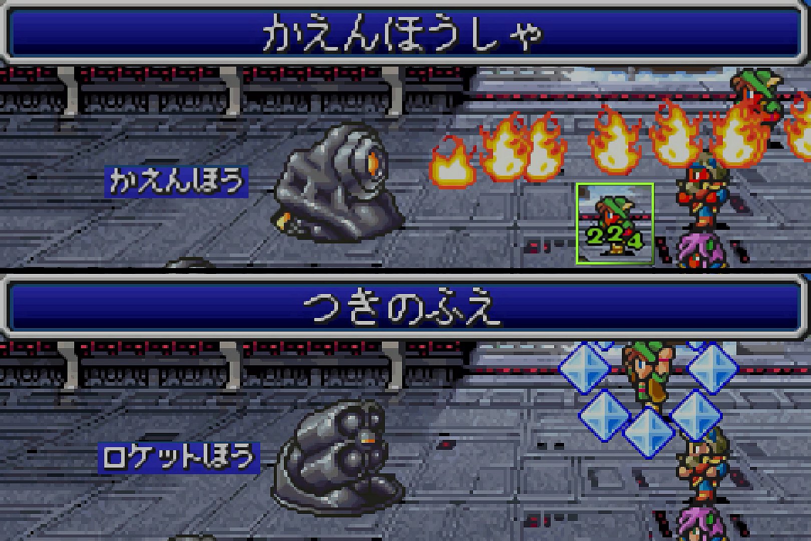 …そして、砲台との戦いについては、バージョンによって微妙に内容が異なる(GBA版まではランダム、旧スマホ版とピでは固定)ようだが、「火炎砲×2」か「ロケット砲×2」と戦うことになる。なお、これらの敵は経験値を持っていないため、普通に全力で戦って良い。