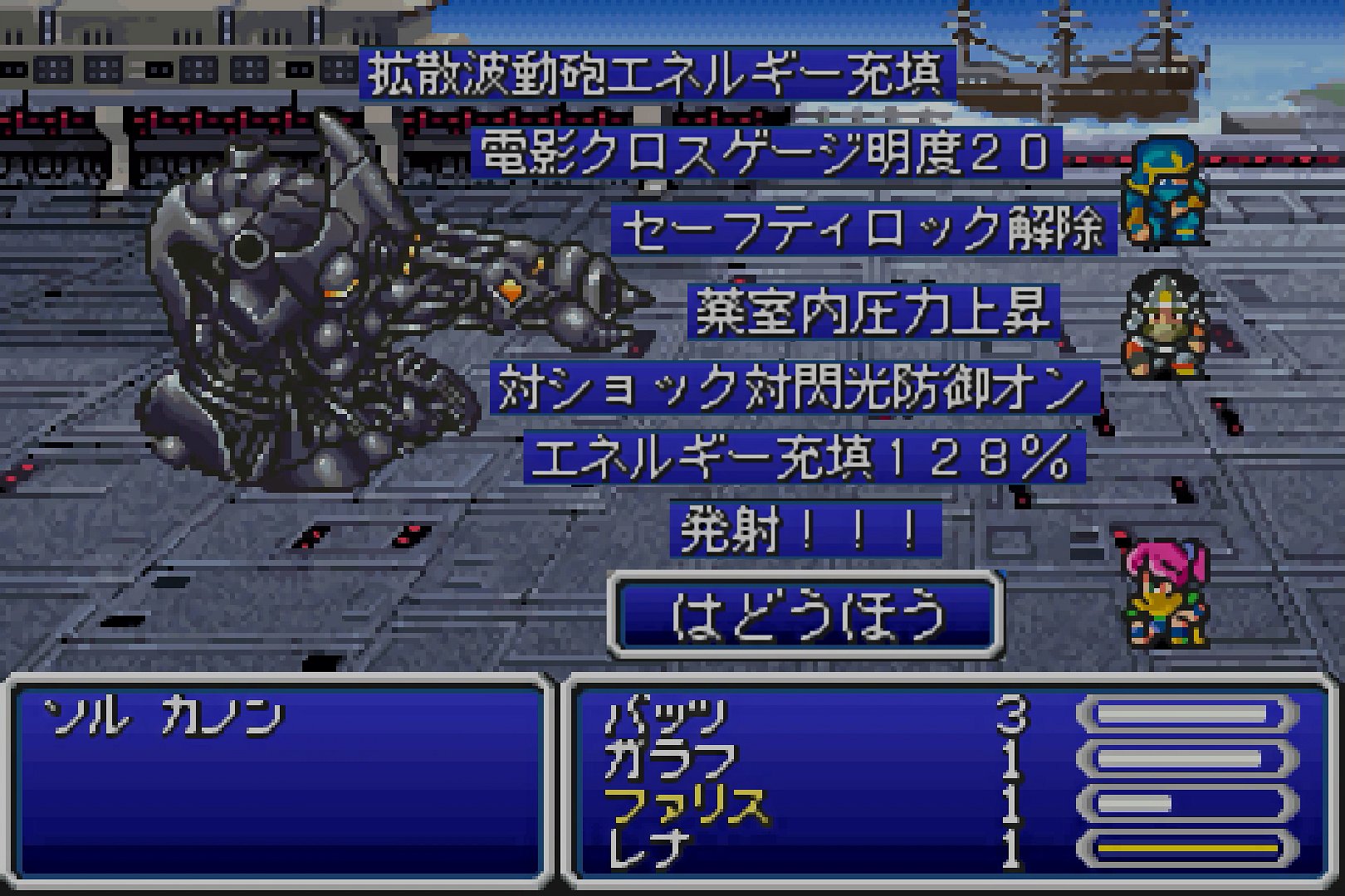 ――そして。ソル カノンのHPを、固定パターンであと1発にまで削ったあとは、必勝法として、ファリスは「かくれる」を使う。ただし、波動砲から身を守るだけではない。ファリス以外の3人を戦闘不能にするのが目的である。そうして、「エネルギー充填128%…発射!!!」のあとの波動砲を喰らい、バッツ・レナ・ガラフが戦闘不能となったら、ファリスが「あらわれる」を使って、「らいじん」を投げる。これにて、無事にバトル終了である。ファリスが経験値40を獲得するが、レベルアップは無い。