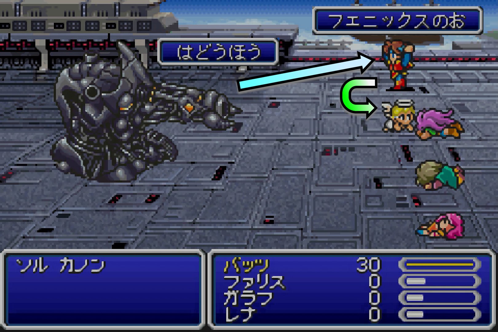 そういうわけで。実戦では、火炎砲への対策として「炎の指輪」を装備し、さらに火炎砲&ロケット砲たちに対して必ず先手を取れるよう、バッツを狩人として「青魔法」をセットし、初手で「月の笛」を使っていった。これで、火炎砲はそもそも炎吸収で無力化でき、ロケット砲に対しても必ず先手を取って味方全員をバーサクにできるので、死ぬことは無くなる。以上、砲台については、完全なる完封が可能となったのである。