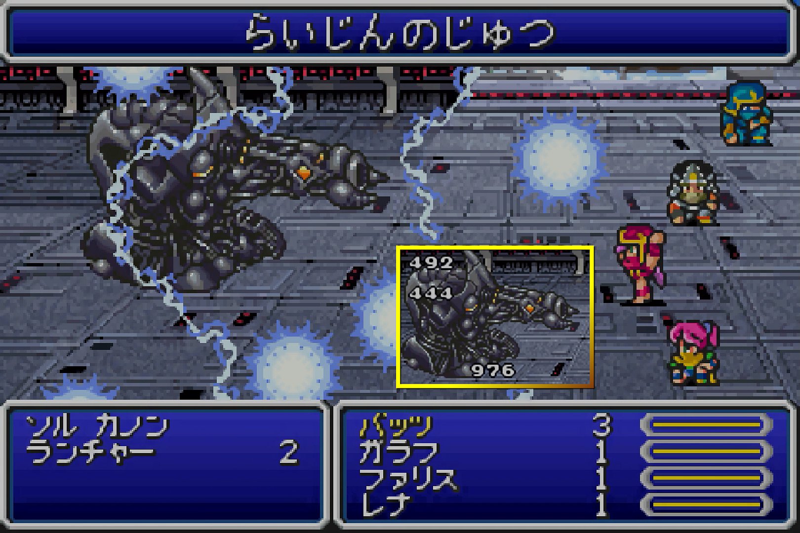 カノン本体は、雷属性を弱点としており、「らいじん」によって、約1000のダメージを与えられる。この際、「約1000」というのは、重要な数値である。なぜなら、ソル カノンの実質HPは12500であり、12000でも13000でも無い。よって、よほど乱数が偏らない限り、13発での安定した撃破が可能だからである。前述の通り、今回バトルは、ファリス1人でトドメを刺すことが重要となるため、使用回数によって安定撃破が可能という特性は、大きなポイントであると言える。更に言うと、FF5のパーティメンバーは4人であるため、「13