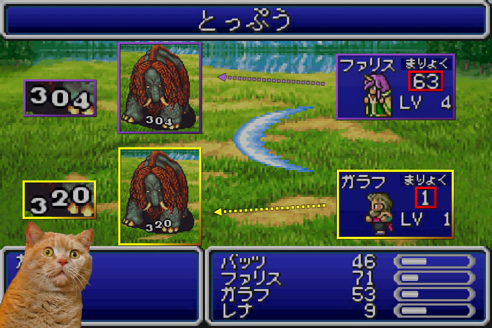 カノン戦は、FF5で経験値入手が必須となる最後のバトル(ピ版を除く)である。敵パーティを倒すと、経験値として「40」が手に入ってしまうため、2114型であれば、ファリス1人でトドメを刺さなければならない。しかし、ファリスがファリスを蘇生させるとかいうヒソカ様のようなことはできないので、誰か別のキャラと交互に蘇生しつつ、上手くファリスの時に倒す必要がある。そして、私は、HP調整を壮大に見誤っており、さすがにそろそろ敵が死ぬだろう…と思っていたところから、更に長くのバトルが必要となった。