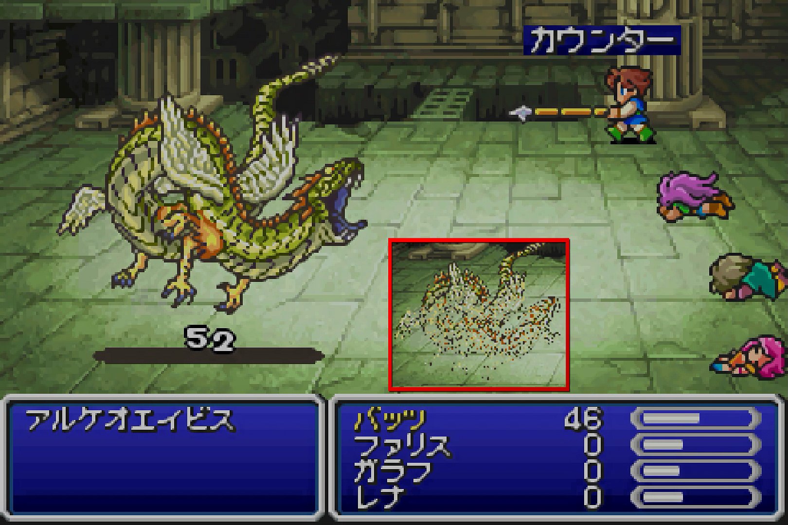 ――そして、頼みのカウンターですら、なかなか発動してくれない。敵は攻撃力も高いため、カウンター待ちの際は、「まもり」を使うことになる(よって、アビリティは、「まもり」「カウンター」で決定となり、「りょうてもち」などを使う余地が無くなる)。しかし、敵は、打撃以外にも、「ブレスウイング」と「スリップ」という特殊攻撃を持っている。ブレスウイングは、FF5恒例の「最大HPの1/4のダメージを与える全体攻撃」であり、カウンター対象にならないうえ、ダメージも無効化できないため、4発もらうと死ぬ。また、「スリップ」は、スリップの追加効果を持つ打撃であり、ダメージ部分は0にできてカウンターも可能なものの、追加効果を防げないため、スリップ状態によってすぐさま死ぬ。ちなみに、FF5のカウンターの発動率は「50%」であるという。本当…?