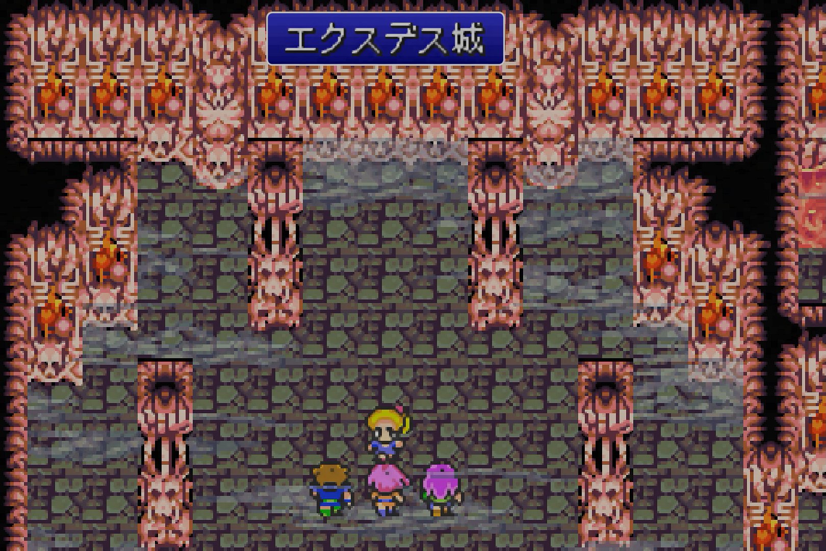…さて。この、真の姿を表したエクスデス城は、これまでに無い異質なデザインである。壁は、生物の内蔵をイメージさせるかのように、ドクドクと脈動している。また、部屋の中にも関わらず、溶岩が流れている。さらに、BGMは、当然のことであるが、「エクスデスの城」が用いられている。この前に同BGMが流れた「バリアの塔」でも、この後に流れる「フォークタワー」でも、それぞれなりに雰囲気には合っているが、このエクスデス城が、「悪の総本山に乗り込んだ」という雰囲気を、最も盛り上げてくれているであろう。