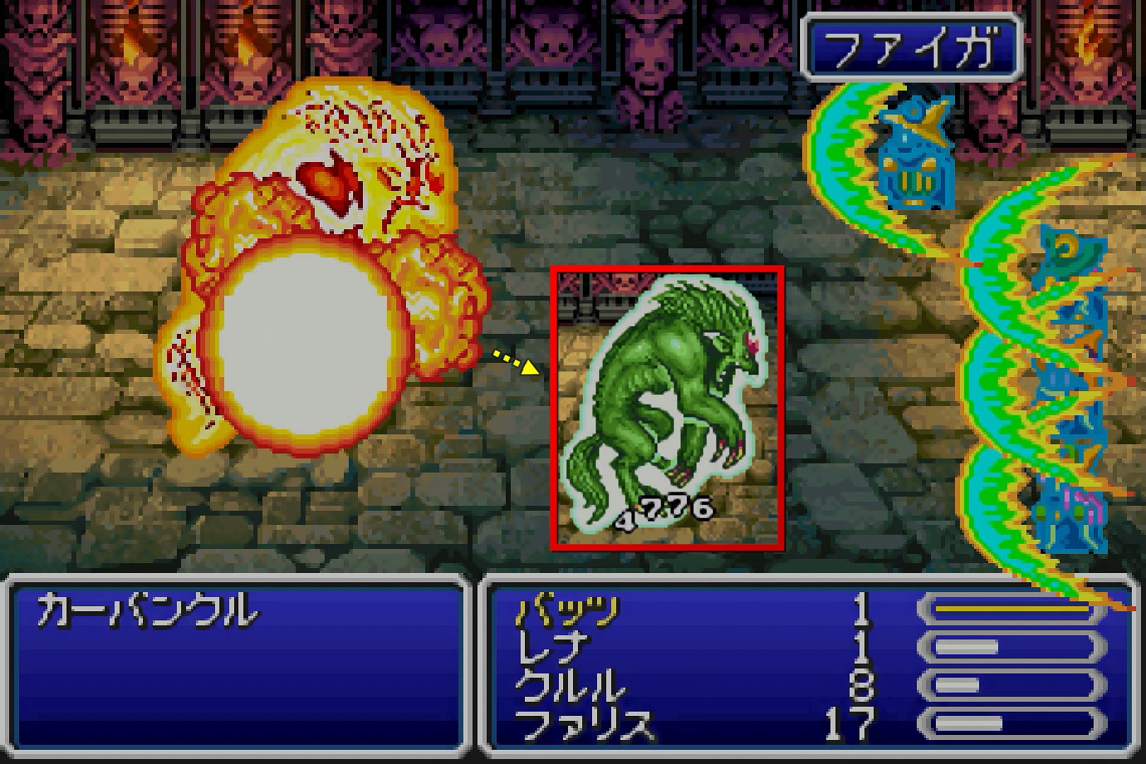 そんな「カーバンクル」は、HP15000で、常時リフレク状態で登場する。行動パターンは、自身へのリフレク反射魔法を3ターン使ったのちに、一時的にリフレクを解除して、自分に「ケアルラ」を使うというパターンを繰り返す。使う攻撃魔法は、HP5000ごとに、「ファイラ・サンダラ・ブリザラ」→「バイオ・ストップ・コンフュ」→「ブレイク・デジョン・デス」とパワーアップしていく。
