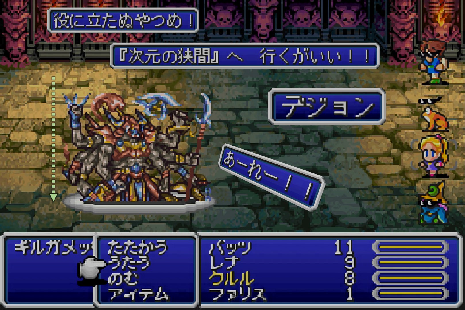 ちなみに。上の図では、クルル以外が暗闇状態になっていたり、レナがカエルになっていたりと、いろいろなステータスが掛かっているが、これは敵の青魔法によるものである。ギルガメッシュは、地味に青魔法の使い手であり、この4戦目では、「小さなメロディ」「フラッシュ」「タイムスリップ」「カエルのうた」をラーニングできる。