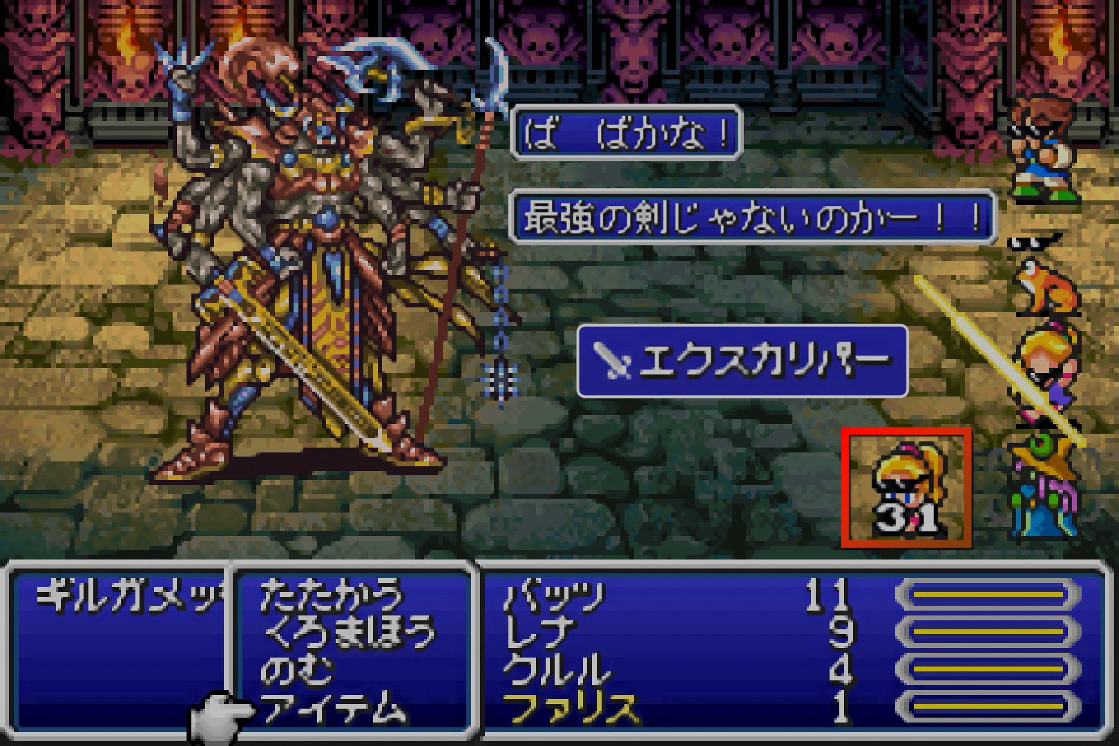さて。話を、エクスデス城でのギルガメッシュ(4回目)戦に戻そう。この戦闘は、通常、エクスデスのデジョンによって終了するが、完全なイベントバトルというわけではなく、バトル冒頭に、まずは13000のダメージを与えなければならない(14000と書かれている場所もあるが、誤りである。GBA版の攻略本も間違えている…)。敵には、これといった弱点属性が無いため、1万以上もの合計ダメージを与えるのは、なかなか難儀である。