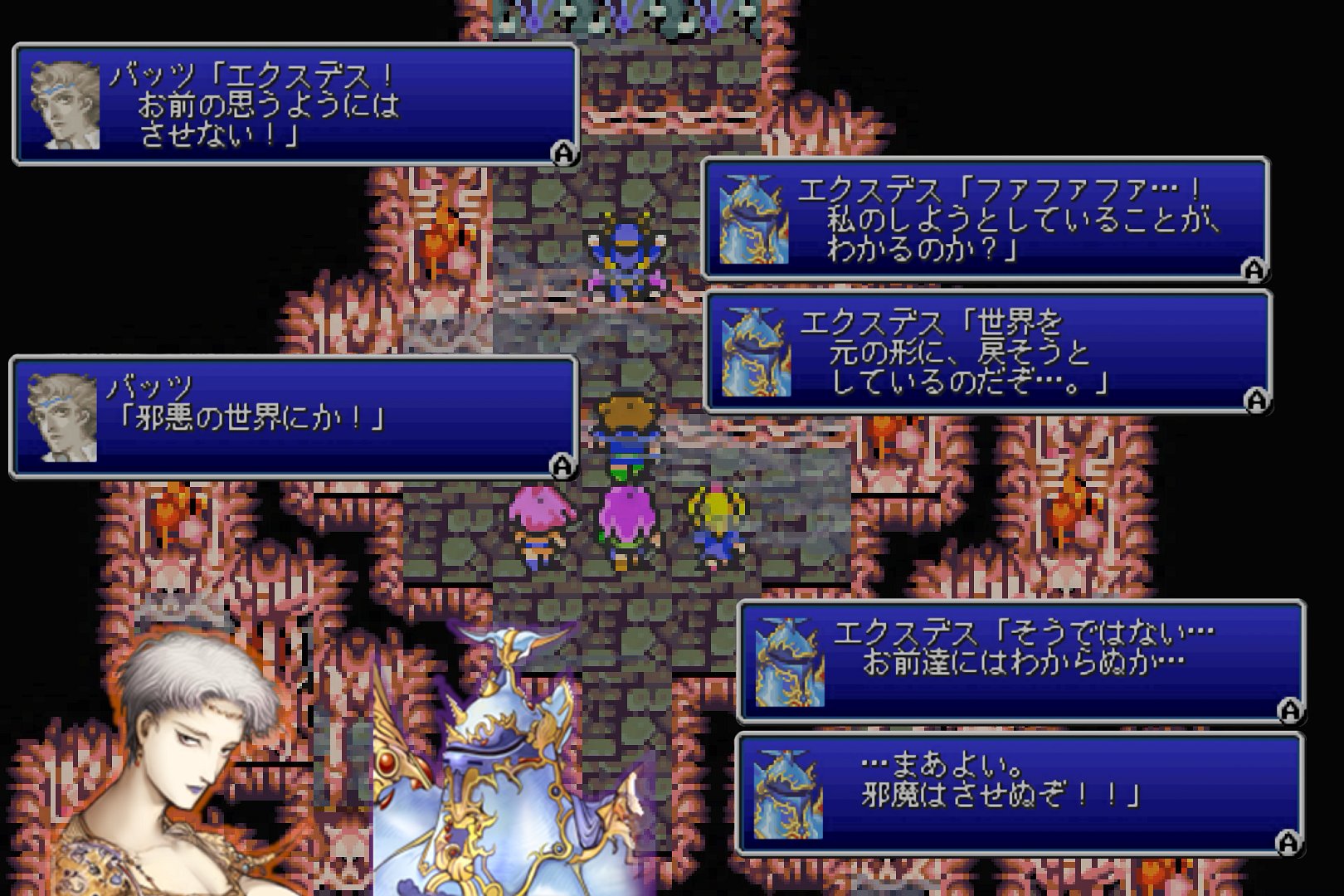 そして。次のダンジョンは、第2世界の最後となる「エクスデス城」である。登場ボスは3体であり、最上階に登場する「エクスデス(1回目)」は、物語上の位置付けだけでなく、バトル面での強さとしても、大ボスに相応しいものを持っている。