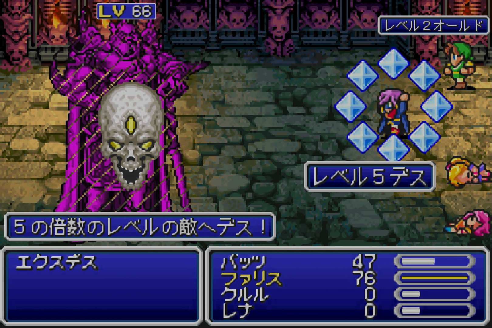 ――さて、老化状態による敵弱体化効果の一つに、「内部的な10カウントごとに、レベル値が1下がる」というものがある。これを1回だけ適用すると、エクスデスのレベルは「65」となり、今度は「レベル5デス」が入るようになる。レベル5デスも、レベル2オールドと同じく、敵耐性を無視するからだ。
