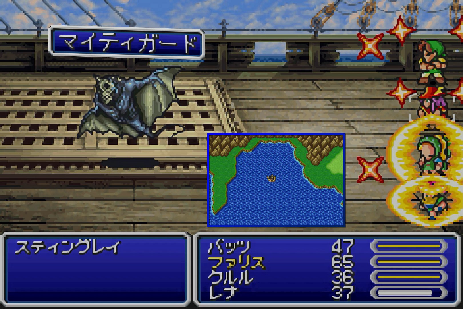 というわけで。スティングレイは、青魔法のマイティガード以外にも、獲得ABP・レア盗み・レアドロップと、様々な美味しさを持つモンスターである。しかも、GBA版であれば、中断からの再開を使うことで、必ず2戦目の相手として出会えるため、出現率の問題まで克服できる。