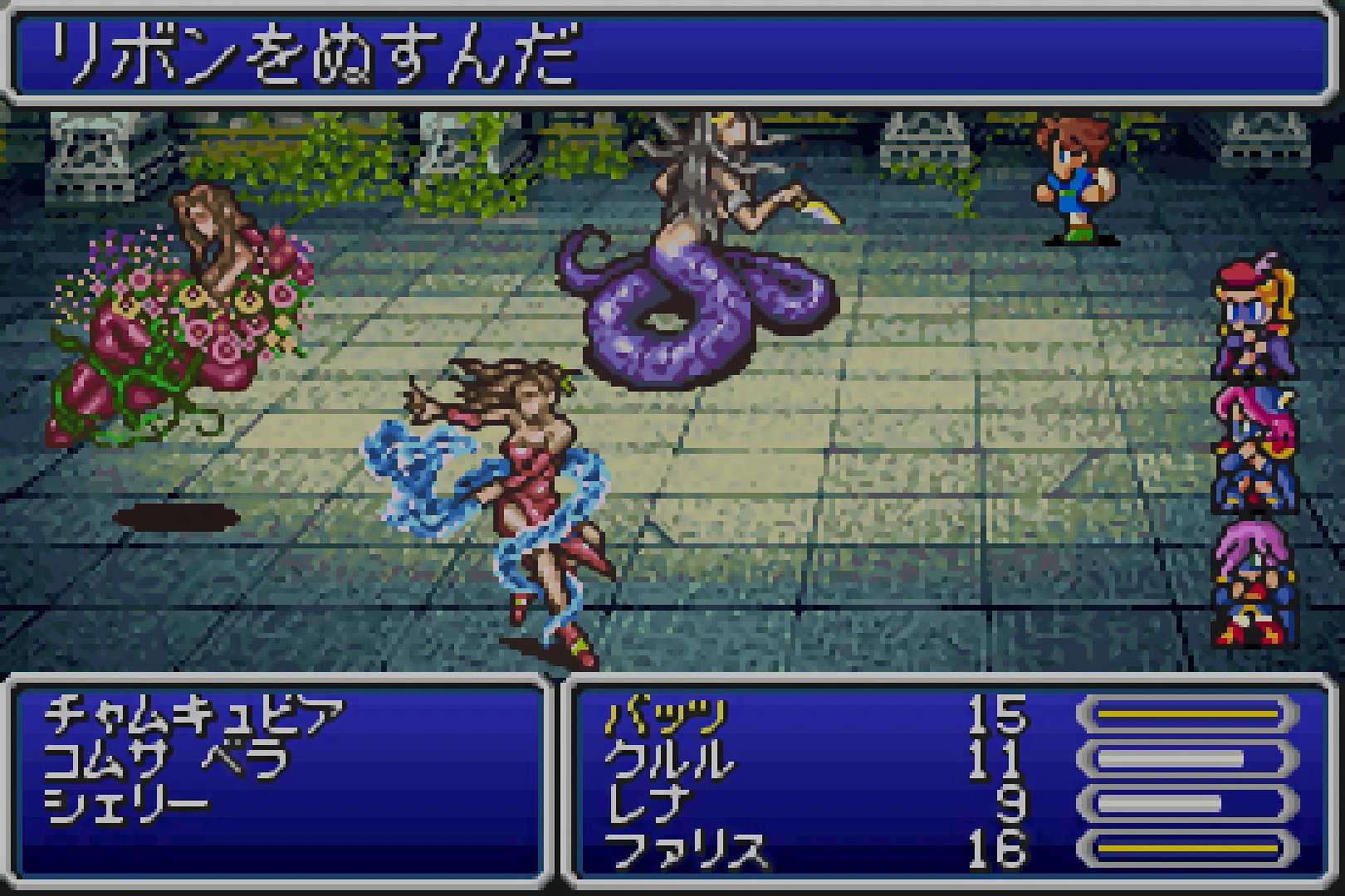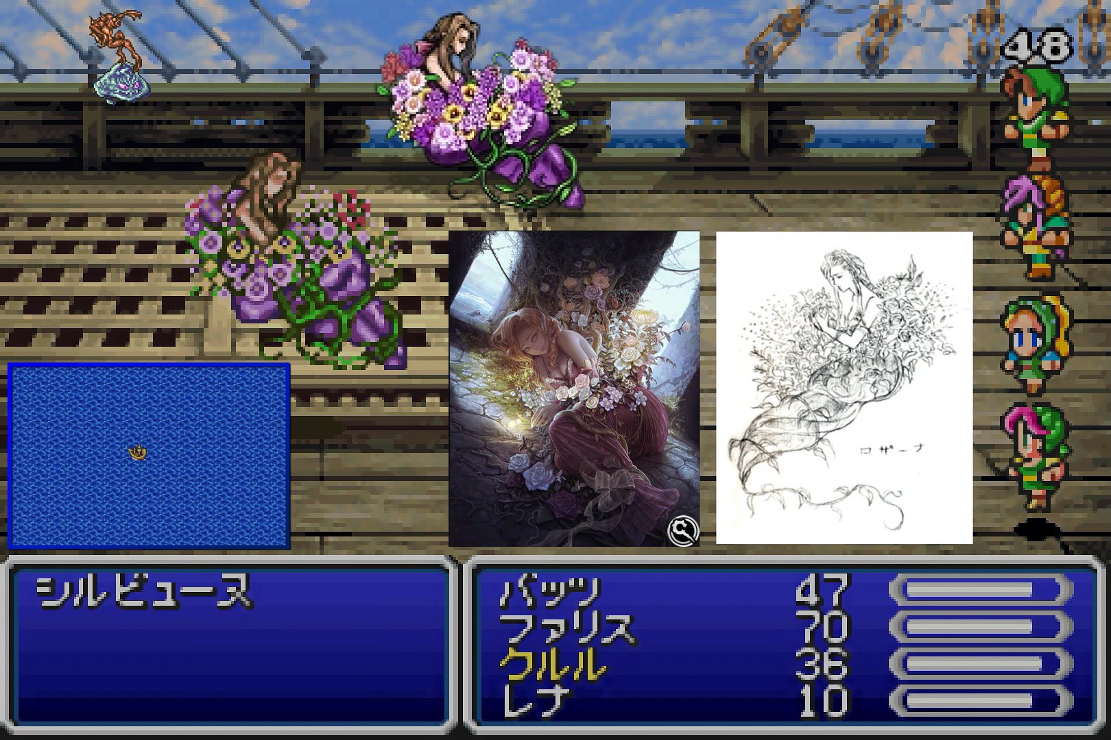 …ただし、これら姦しい魔物たちに、ステータス魔法はすべて有効である。そのため、歌でまず手早く行動を封印し、その後に眠らせてしまえば、好き勝手にアイテムを盗むことができる。そして、「死の宣告」でトドメを刺せば、入手経験値も回避できる。やれ、砂漠に立つ幻の塔に登場する女性モンスターたちを、歌で誘惑し、追い剥ぎをし、呪いの言葉で消滅させていくバッツたち一行…。ユニット名は「幻想旅団」とかでどう?