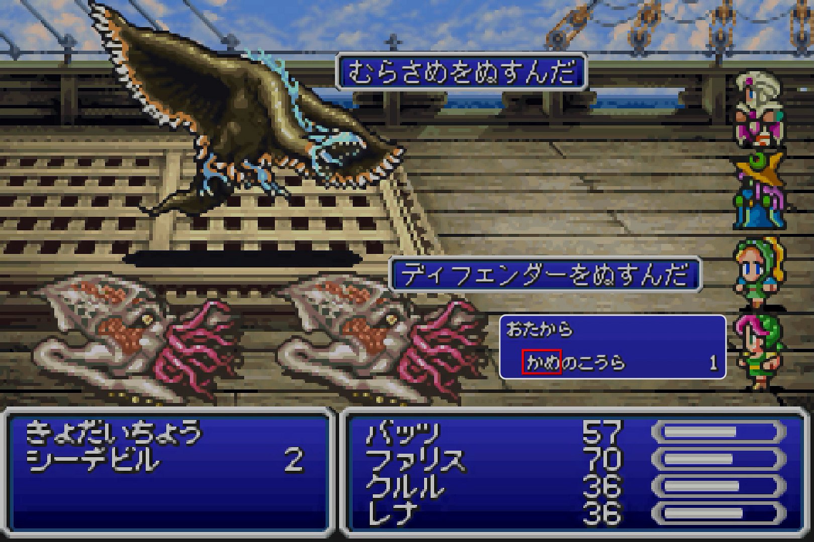 …更に、シーデビルは、1/16のレアドロップで、「亀の甲羅」を落とす。こちらも有用であり、「ドレインキッス(威力255の魔法攻撃)」や「ヘイストドリンク(「のむ」と異なり、対象が自由)」「亀の甲羅割り(防御力ダウン)」などで使える調合素材となる。レアドロップとはいえ、シーデビルは複数体で登場するため、それなりのペースで増えていってくれるのは嬉しい。なお、シーデビルは、どう見てもイカなので、FF5世界の住民にはイカが亀に見えているという奇説を除けば、シーデビルは、海に住む亀を襲ってバリバリ食べているということであろう。第3世界の荒廃具合が察せられるというものだ。