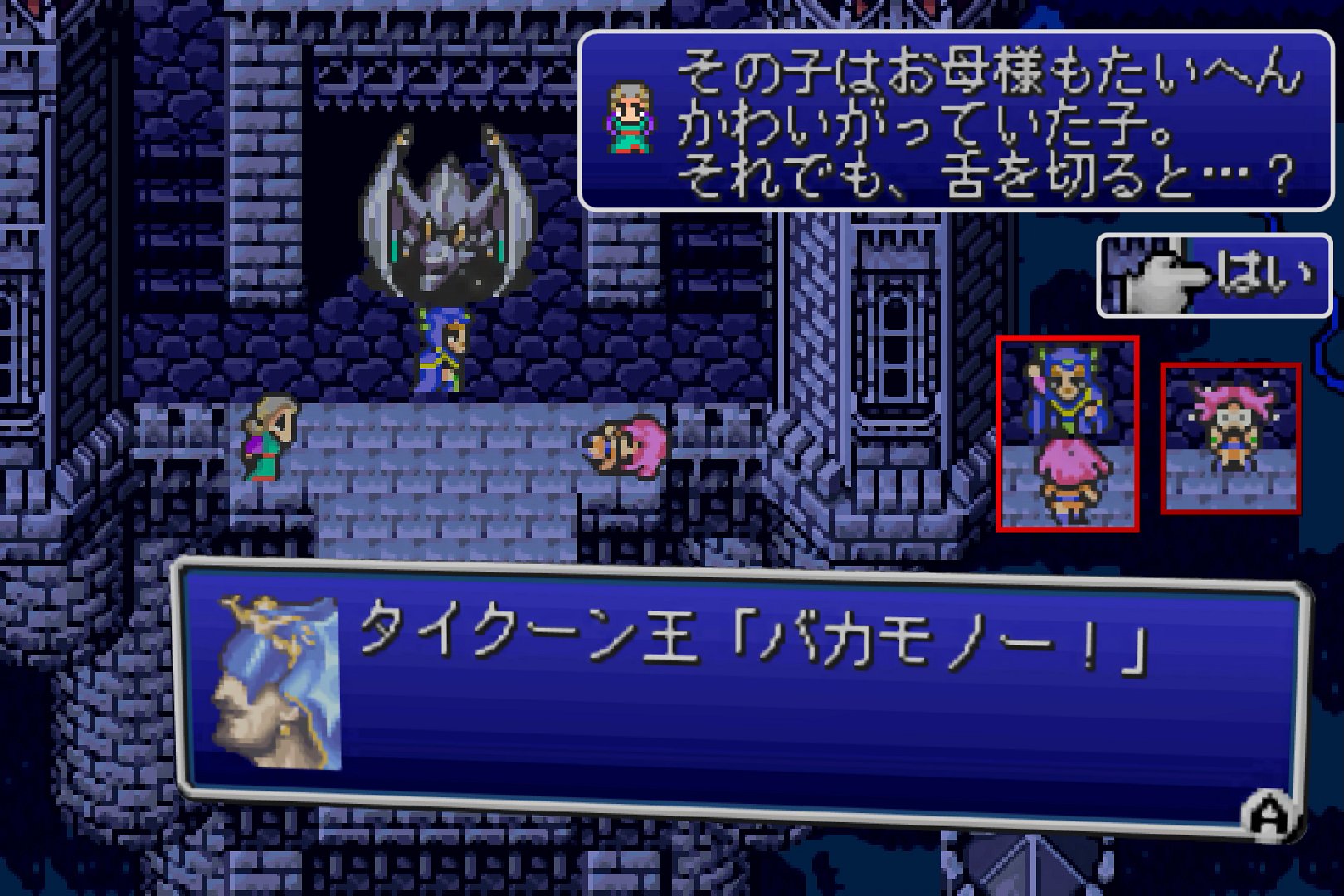 ――なお、どちらを選んでも、展開に変化はないが、「はい」を選んだ際の、タイクーン王の「バカモノー!」というセリフは、静かな名台詞として知られている。タイクーン王は、様子が変なだけではないのだ…。