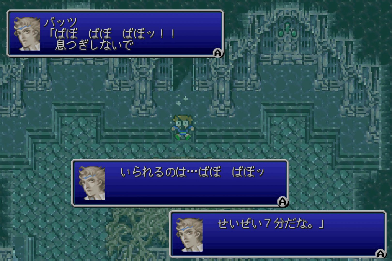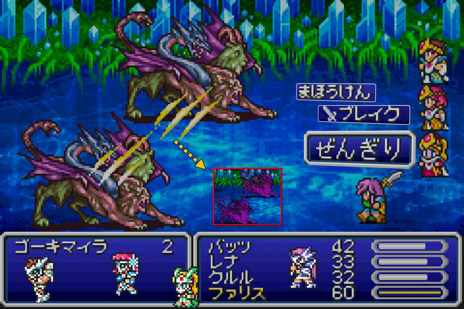 ――が、今回の私は、あえてGBA版を使っているということで、このバグについては、積極的に活用をしていくことにしたい。もちろん、私個人としてのFF5環境も、それなりに極まってきている状態である。そのため、「ごうせい」を単純なカウンター封じによる楽々法として使うのではなく、戦闘バリエーションの一つとして用いていくようにしたい。私のプレイを見て、FF5って奥深いなとか、追加要素のあるGBA&旧スマホ版をプレイしたなと思ってくれる人が現れたら、それはとっても嬉しいなって、ものである。