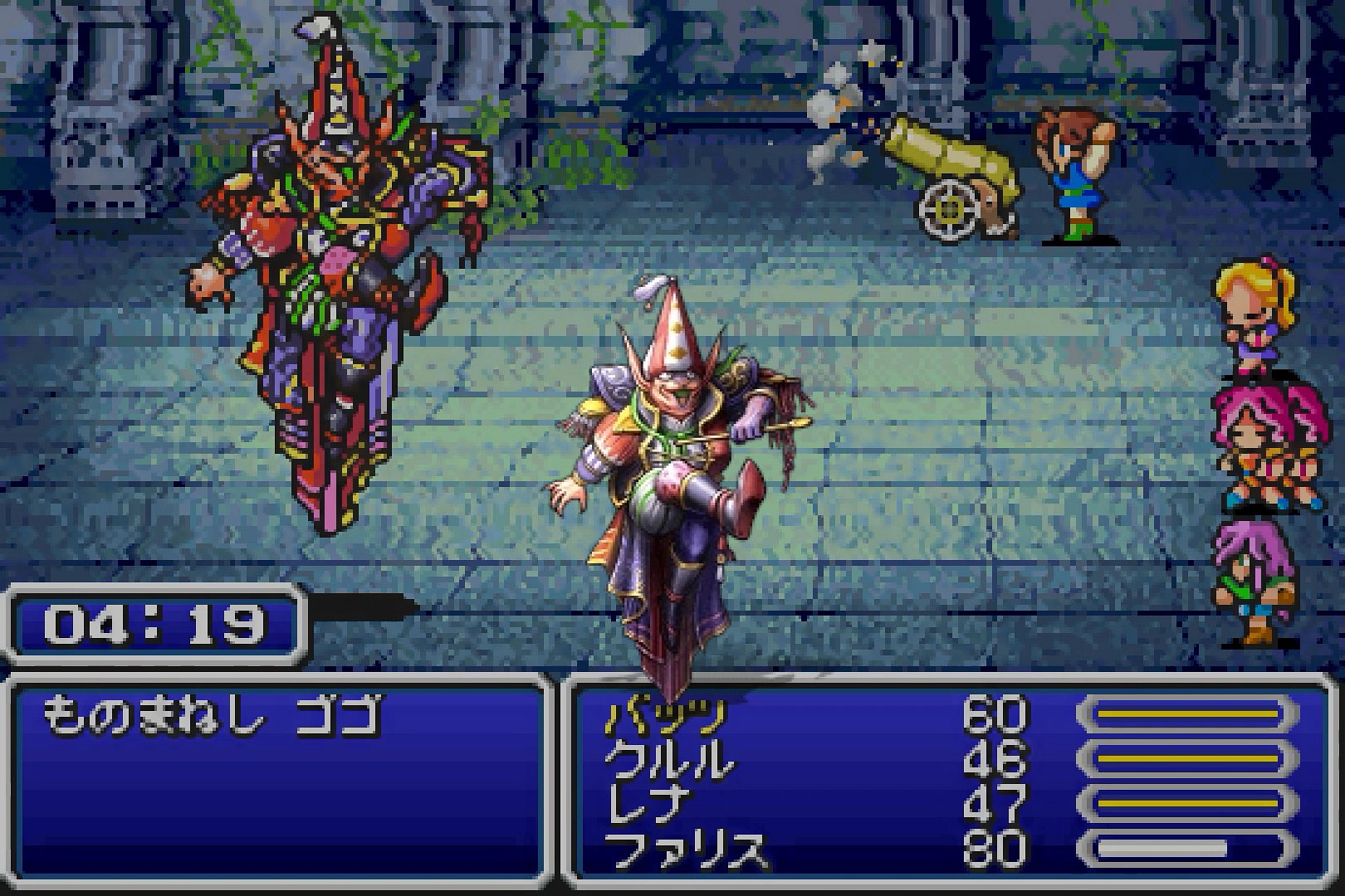 そんな感じで、ものまね師ゴゴは、砲撃士の尋常ではない高性能を示すための、最初の人身御供となった。GBA版限定のカウンター封じに、「75%」という固定の発動率を持つステータス攻撃に…。FF5の環境を変化させるに、十分なインパクトのあるジョブと言えるのだ。