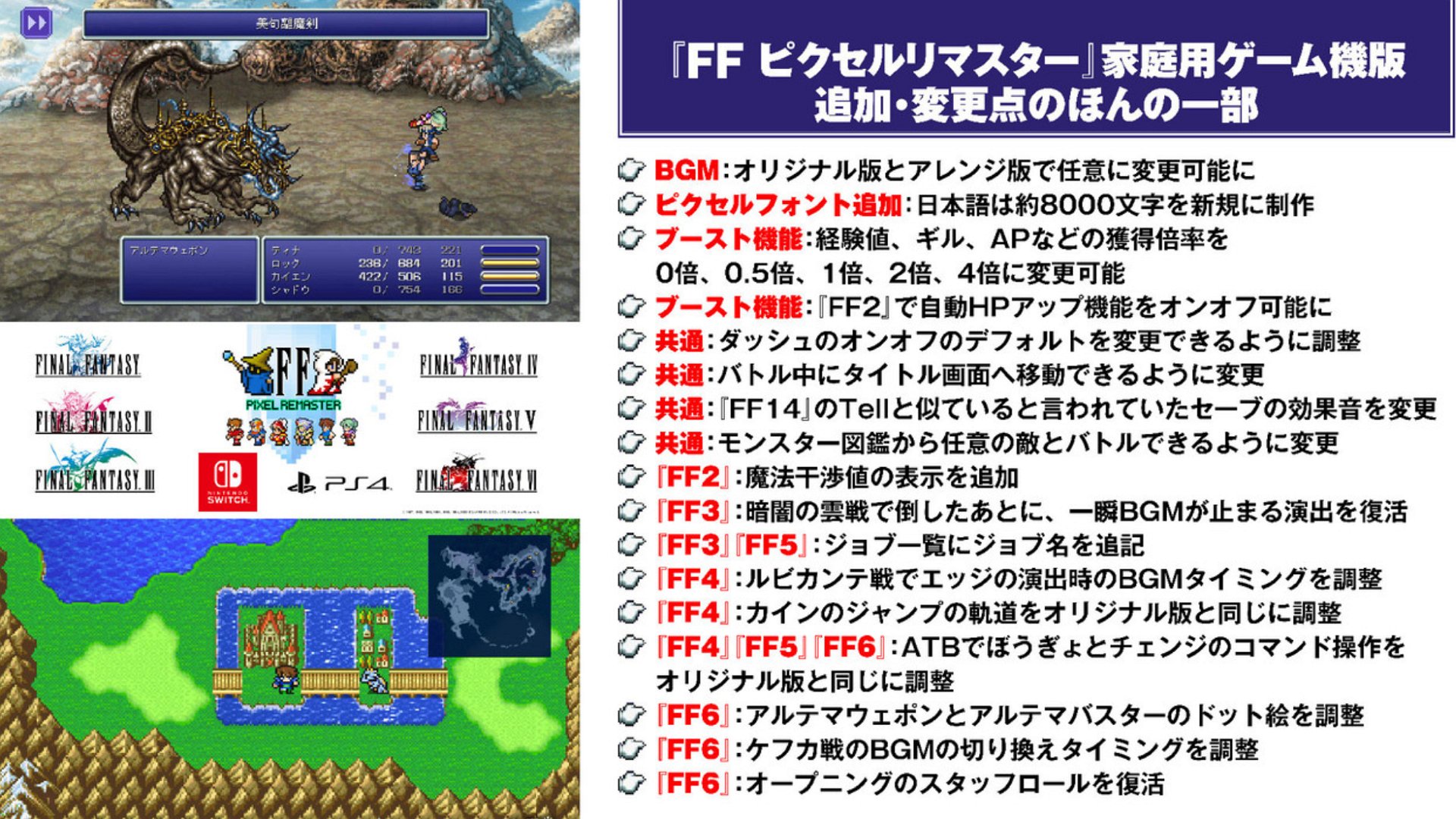 そして。今回の更新時期に起こったこととして、2023年4月20日に、PS4/スイッチ版の”ピ”こと、ピクセルリマスターが発売された。以前、日記のほうでも触れた通り、今回のCS機移植に際して、新規の手直しが施されたようだ(【日記:2023/4/6】)。その内容として、全作共通で、原作BGMの収録や、経験値の0〜4倍といったブースト機能が搭載された。また、それ以外にも、細かい修正が為され、例えばFF5では、やっとフェニックスの塔の壁にモンスターが埋まるようになったり(【関連:第16話の該当部分】)、魔法エフェクトが原作に似たものになっていることもあるなどの改善がされている。どうも、今回CS移植に携わったプロデューサーが有能であり、これら大量の改善点を書き出して、一つ一つ導入をしていったようだ(【ファミ通のインタビュー記事】)。