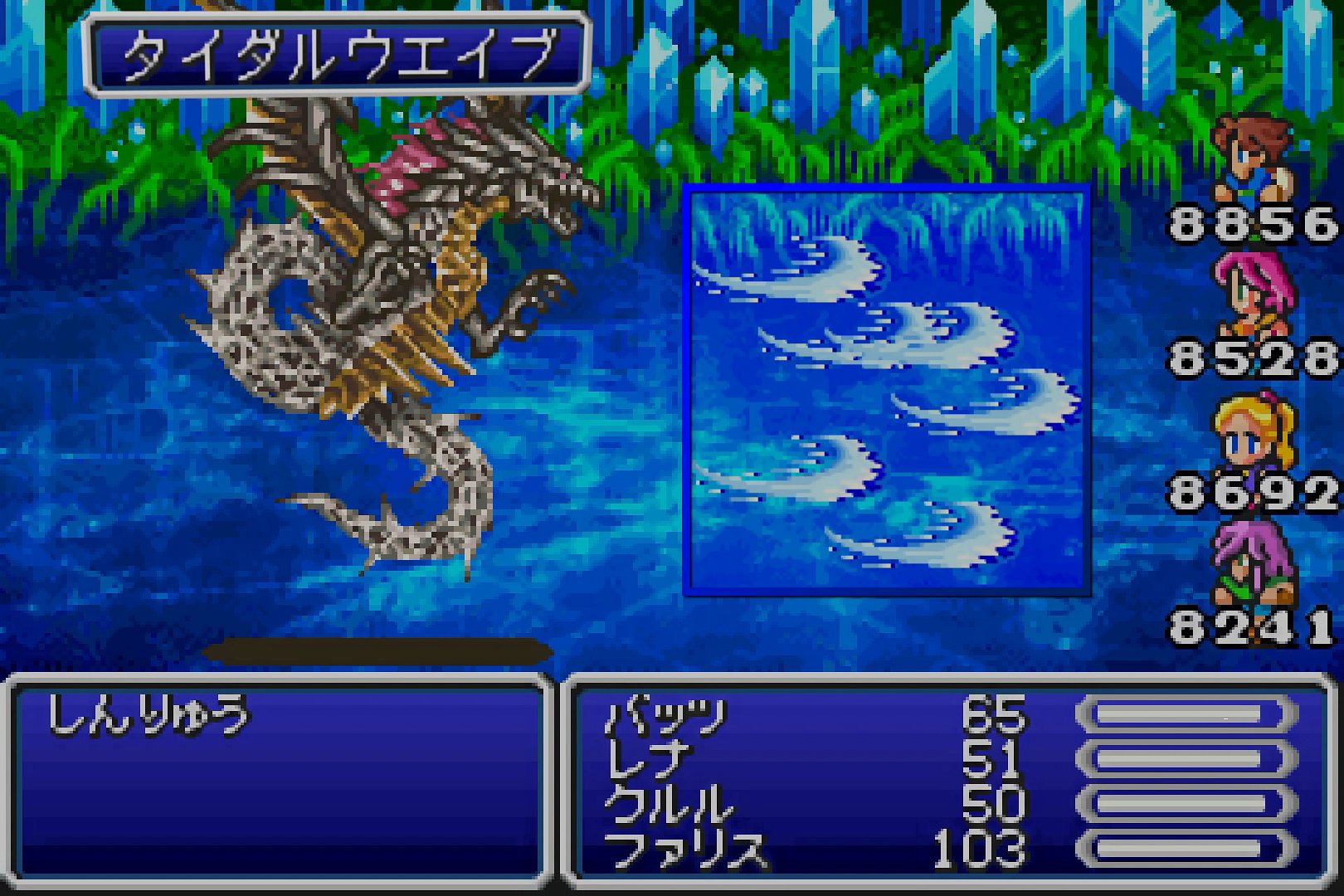 そして、そんな宝箱から出てきた神竜は、1ターン目に「タイダルウエイブ」(FF5ではこの表記)を使う。厳密には、1ターン目の行動は「何もしない」であるのだが、敵素早さが87と激烈に高いため、「まさむね」か「エルメスの靴」でなければ、先にターンが回ってくることはない。