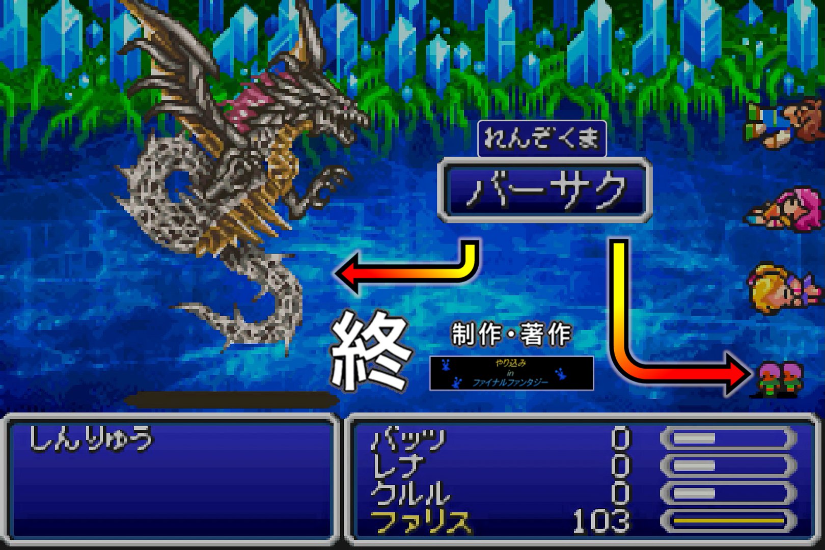 FF5では、敵側のバーサクを解除した際に、ATBゲージがリセットされる(味方側は、発動時と解除時の両方。他、バーサーカーのジョブに就いた場合と、他ジョブにサポートアビリティ「バーサク」を付けた場合は、またそれぞれで動作が異なる)。よって、敵よりも2倍以上早いキャラが、「バーサク発生」→「解除」を繰り返せば、それだけで相手は何の行動もできなくなる。この方式を使い、神竜を完封で倒してみることにした。