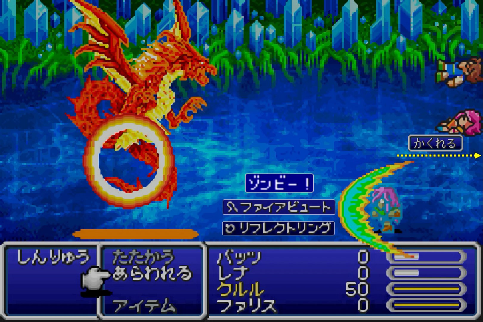 そして。ゾンビ化したファリス以外の1人は誰でも良いので、とりあえずクルルということにして、「まさむね」で初手を取れるようにし、アビリティに「かくれる」をセットする。これで十分であり、防具やアクセサリは空欄で良い。そして、戦闘が始まったら、神竜の初手:「何もしない」に対して先行を取れるため、すぐ「かくれる」を使う。以上である。あとは、ゾンビ化したファリスが、ファイアビュート追加効果のファイガを、リフレクトリングで反射させることで、炎耐性も回復能力も持たない神竜に、着実にダメージを与えていける(他、「アトミックレイ」の反射でも、微弱なダメージを与えられる)。神竜の攻撃は、決してファリスを消滅させることはできない。時間は掛かるが、これで勝利が確定である。