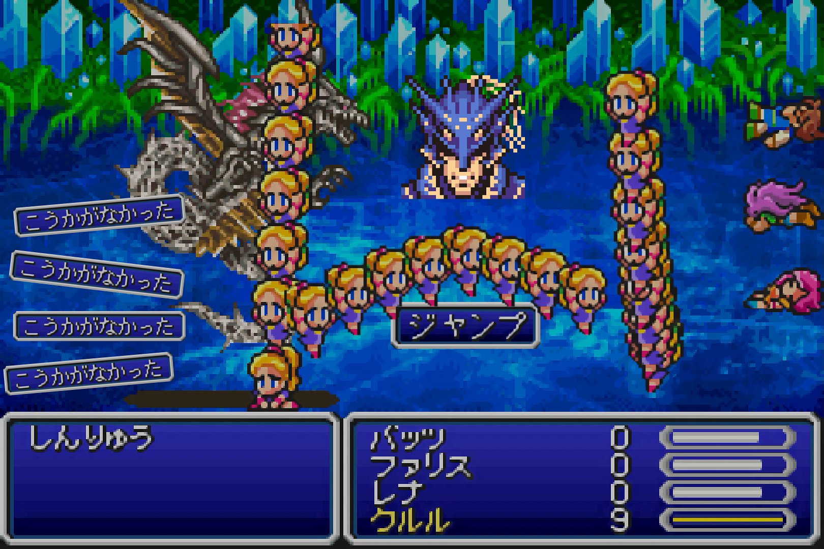 ――よって、最終的には、「適当にやって、それで勝てたらOK!」という感じの、何ともFF5らしくない戦い方となってしまった。もちろん、「素早さを78に調整して、ジャンプで敵の攻撃を避け続ける」という部分は変わっていないのだが、78ピッタリに調整したつもりでも上手くいかないこともあるし、そもそも78に合わせられたか確認する手段も無い。「素早さ78くらいでジャンプをし続ければ、勝てることもある」としかできなかったのである。