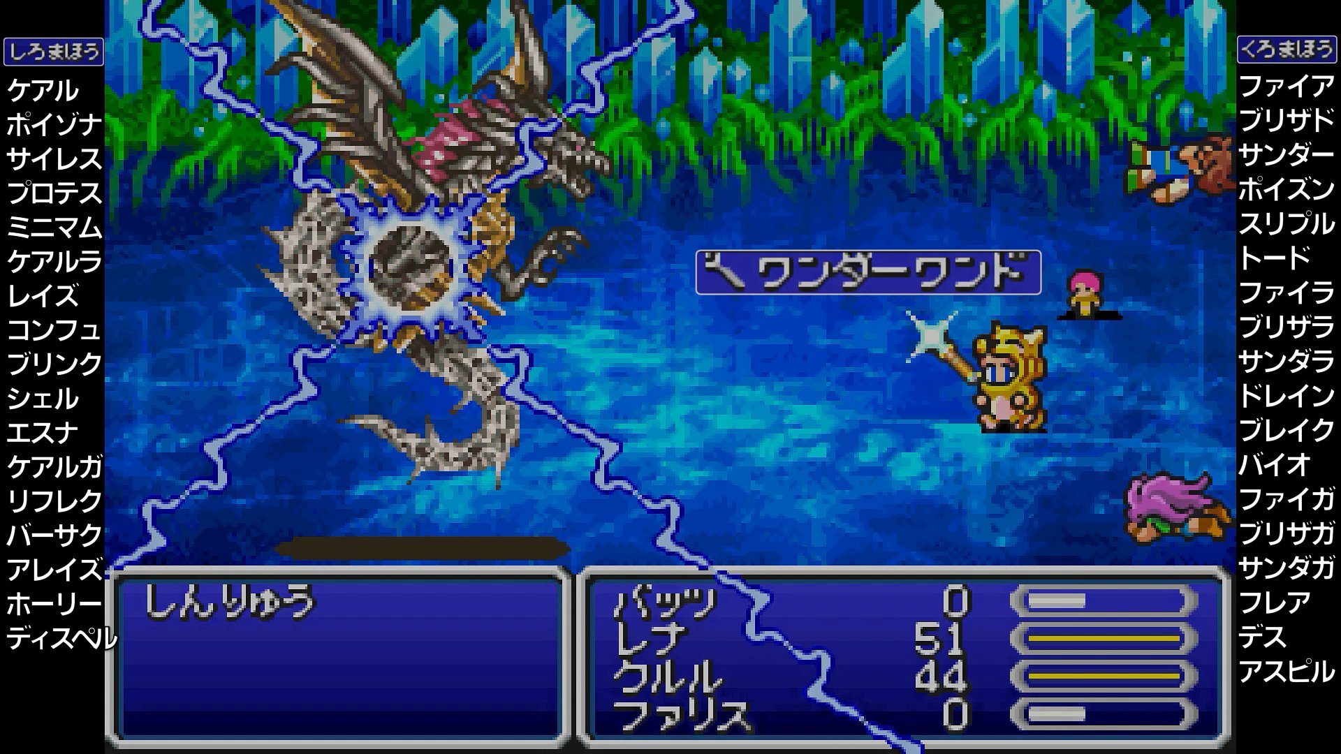 ――ただ、もちろん、ご覧のゲームはFF5ということで、この武器にも使い道は存在する。召喚獣ほどでは無いものの、1回で戦況を一変させる魔法というのは存在するので、「魔法のランプ」のようにあらかじめ調整をしておき、決め打ちをするという方法が可能である。また、「たたかう」で魔法が発動することに注目し、バーサーカー縛りで、敵側に「バーサク」「ディスペル」を使うことに使用可能だ。その他、ジョブチェンジ・ショップ利用・ABP獲得などを制限したプレイで、魔法の購入や魔法コマンドのセットなどを自由に行えない場合、ワンダーワンドの出番も出てくるだろう。