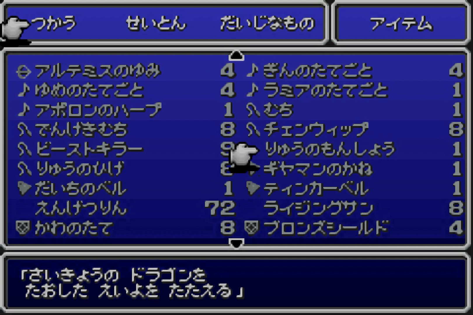 …何故なら、装備欄のうち、4つが既に埋まっているうえ、小人状態であるため、攻撃手段が存在しないのだ。まず、小人なので、通常の打撃での威力には全く期待ができない。竜討伐のリーサルウェポンとして知られる「アポロンのハープ」は、魔法攻撃武器であり小人状態でもダメージが下がらないが、例によって両手武器なので、この状況では装備不能である。ならばと、魔法攻撃に軸を移そうにも、神竜は魔法防御力も「60」と、思ったよりも遥かに固く、弱点属性も無いため、ただ魔法攻撃を使うだけでは、果てしない時間が必要となってしまう。