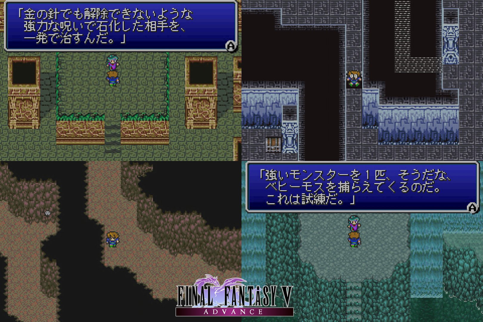 …さて、ここは、本編ラスボスの撃破&伝説の12武器の入手後(第3世界で先回りをしてラスボスだけを倒してもダメ)に探索できるダンジョンであり、6体のボス敵が追加されているほか、多数のGBA版新規アイテムが手に入る。ダンジョンは極めて難解かつ広大であるうえに、多数の仕掛けが用意されている。また、ボスだけでなく、雑魚も強力であるが、そのぶん、各種の稼ぎを行いやすかったりと、お得な点も多い。非常に遊びごたえのある、FF5らしい新マップだ。